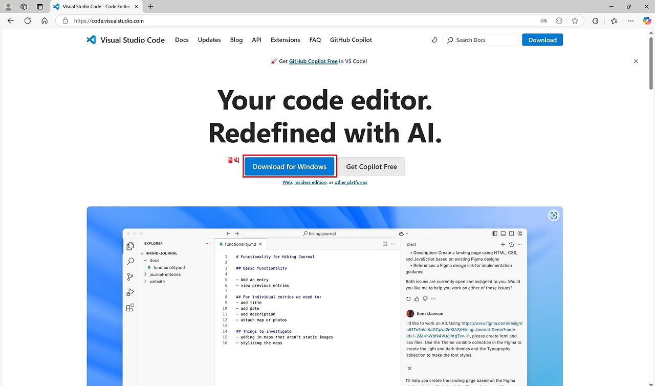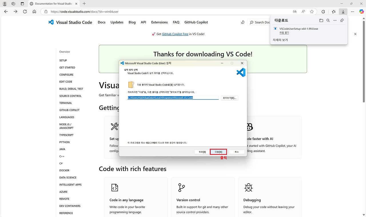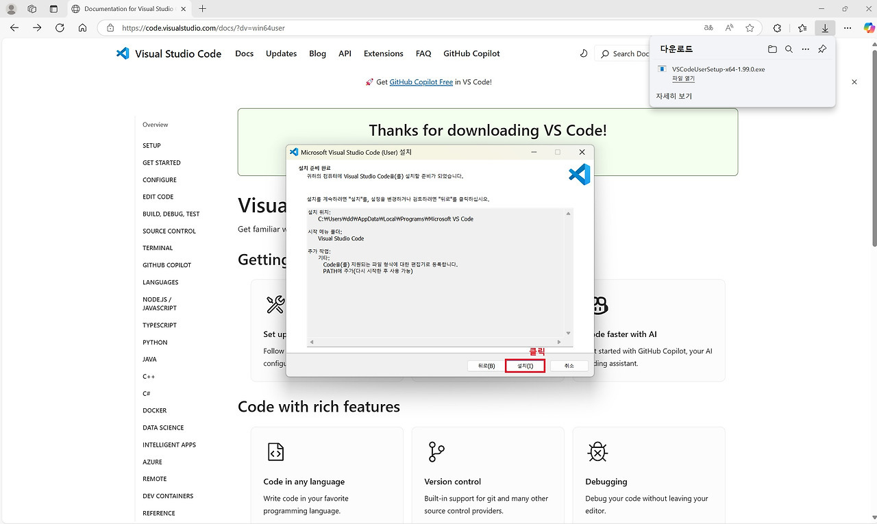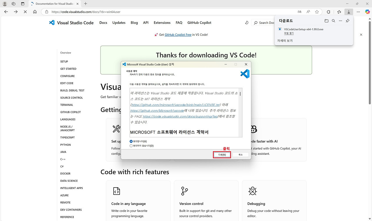 우선 위 Visual Studio Code 공식 웹사이트에 접속합니다. 메인화면 중간에 [Download for Windows]를 클릭하고 다운로드하여지는 설치 파일을 실행합니다. 설치 팝업 화면이 활성화되면 안내에 따라 '동의', '다음', '설치' 버튼 등을 아래와 화면과 같이 순서대로 클릭해서 설치를 진행합니다.
