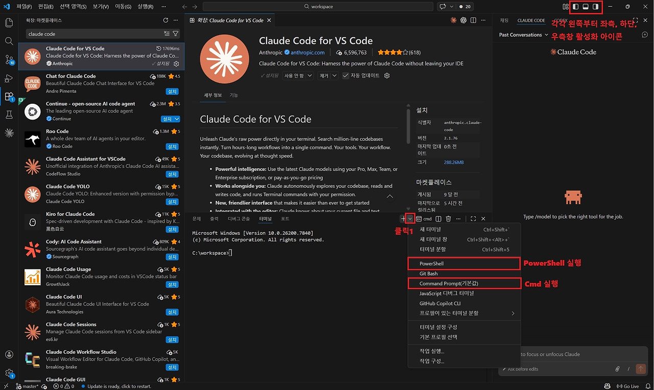 터미널용 Claude Code CLI 버전은 PowerShell 또는 Cmd에서 설치할 수 있습니다. 아래 그림과 같이 PowerShell 또는 Cmd를 클릭해서 VS Code 하단에 터미널을 활성화시킵니다. 만약 하단 Cmd 화면이 활성화되어 있지 않다면 우측 상단에 있는 창 활성화 버튼 중 하단창 활성화 버튼을 클릭하여 창을 활성화시킨 후 아래 방향 화살표 클릭 다음으로 [PowerShell] 또는 Command Prompt 메뉴를 클릭해서 터미널 창을 활성화시킵니다.