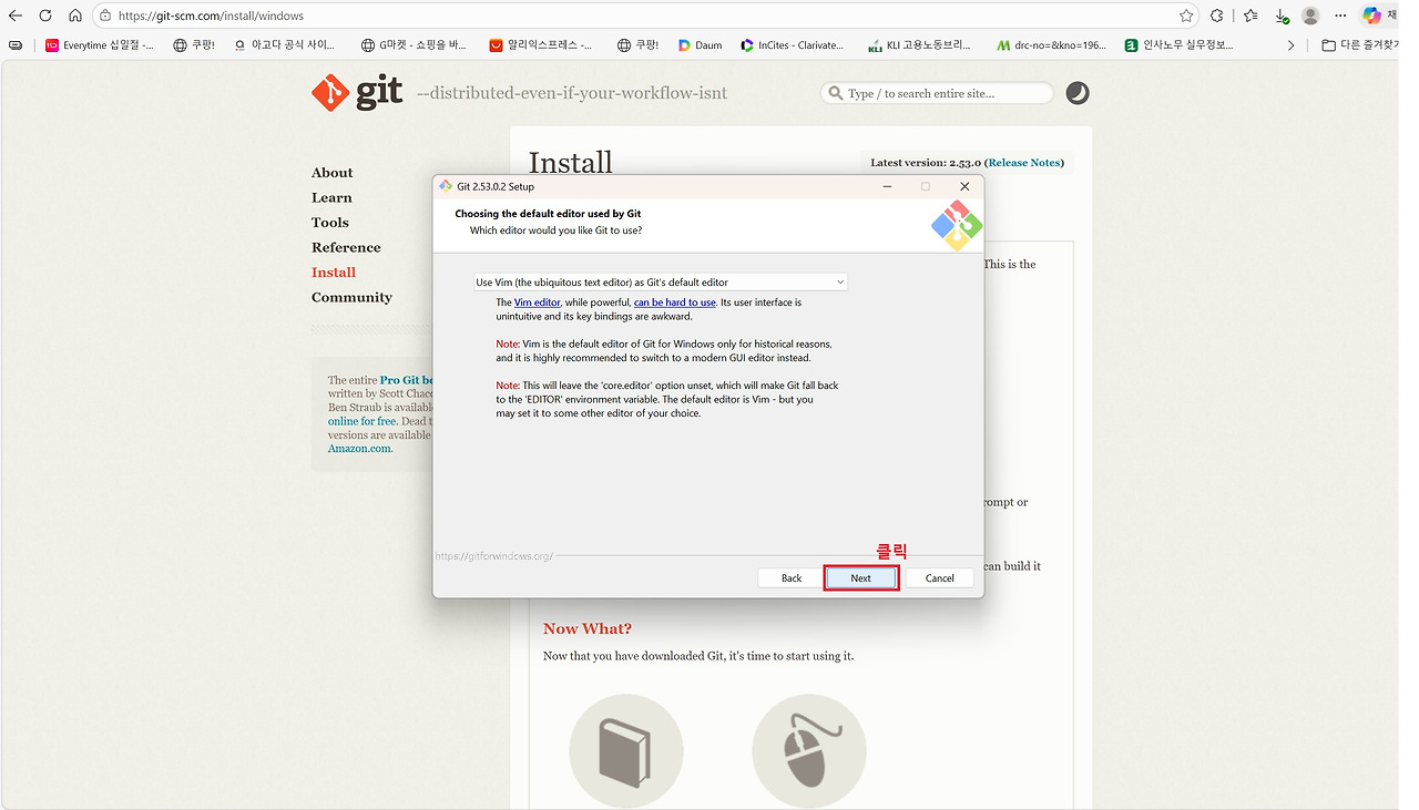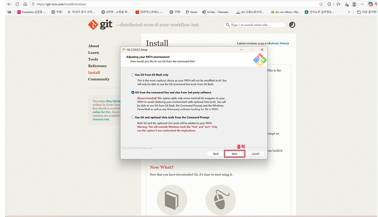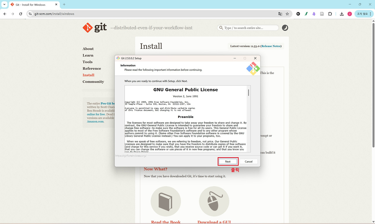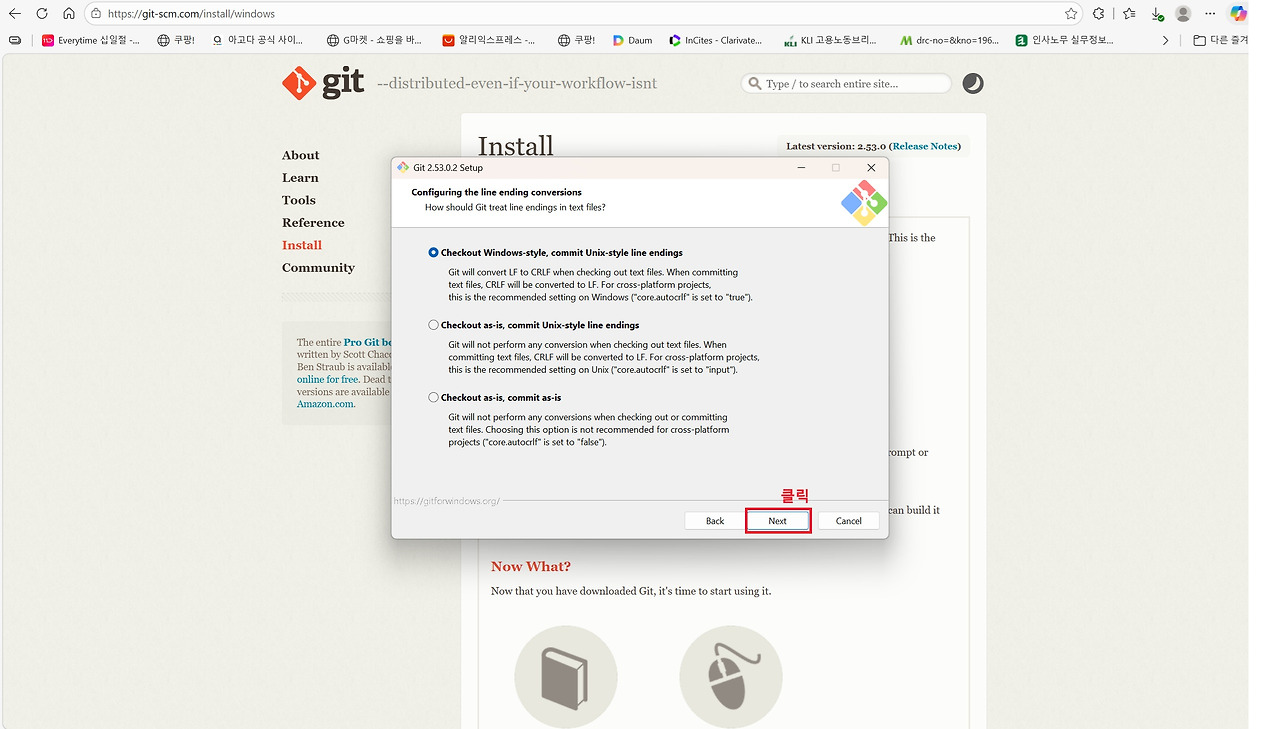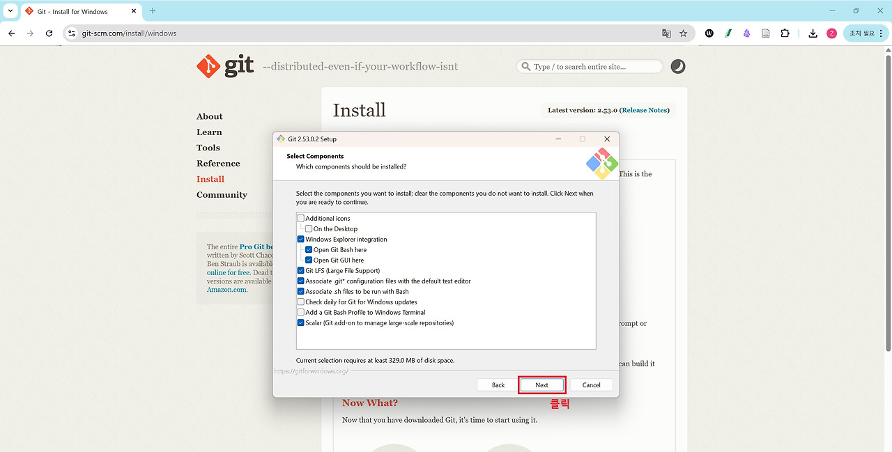 세 번째는 Git입니다. Git은 소스코드의 변경 이력을 관리하는 버전 관리 도구로 대부분의 개발 환경에서 기본적으로 사용됩니다. Claude Code 역시 프로젝트 작업 과정에서 Git 명령어를 활용할 수 있기 때문에 Git for Windows를 함께 설치해 두는 것이 권장됩니다. Anthropic의 Windows용 터미널 가이드에서도 Git 설치를 기본 개발 환경 구성 요소로 안내하고 있습니다. 아래 그림을 통해 확인할 수 있는 것처럼 설치 과정에서는 별도의 설정을 변경할 필요 없이 기본 설정값으로 Next 버튼을 클릭하며 진행하면 어려움 없이 설치할 수 있습니다.