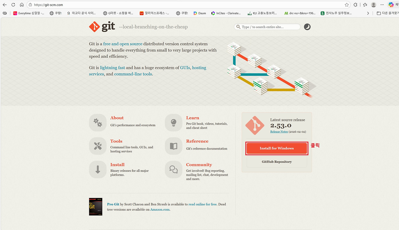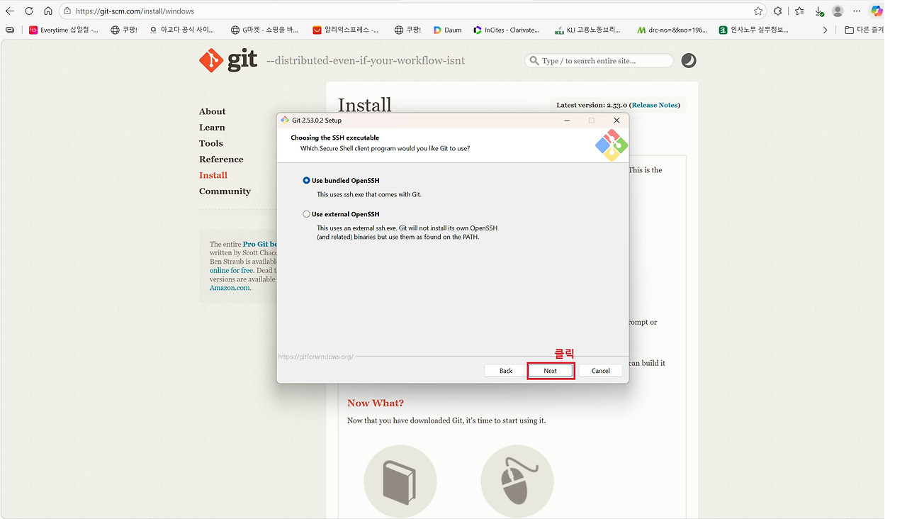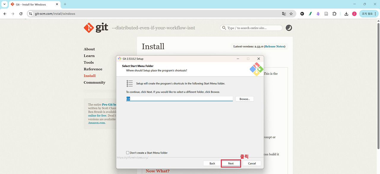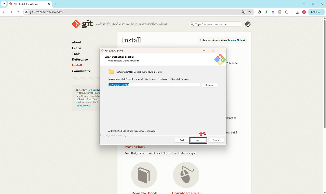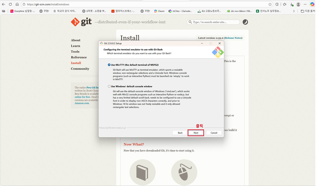 세 번째는 Git입니다. Git은 소스코드의 변경 이력을 관리하는 버전 관리 도구로 대부분의 개발 환경에서 기본적으로 사용됩니다. Claude Code 역시 프로젝트 작업 과정에서 Git 명령어를 활용할 수 있기 때문에 Git for Windows를 함께 설치해 두는 것이 권장됩니다. Anthropic의 Windows용 터미널 가이드에서도 Git 설치를 기본 개발 환경 구성 요소로 안내하고 있습니다. 아래 그림을 통해 확인할 수 있는 것처럼 설치 과정에서는 별도의 설정을 변경할 필요 없이 기본 설정값으로 Next 버튼을 클릭하며 진행하면 어려움 없이 설치할 수 있습니다.