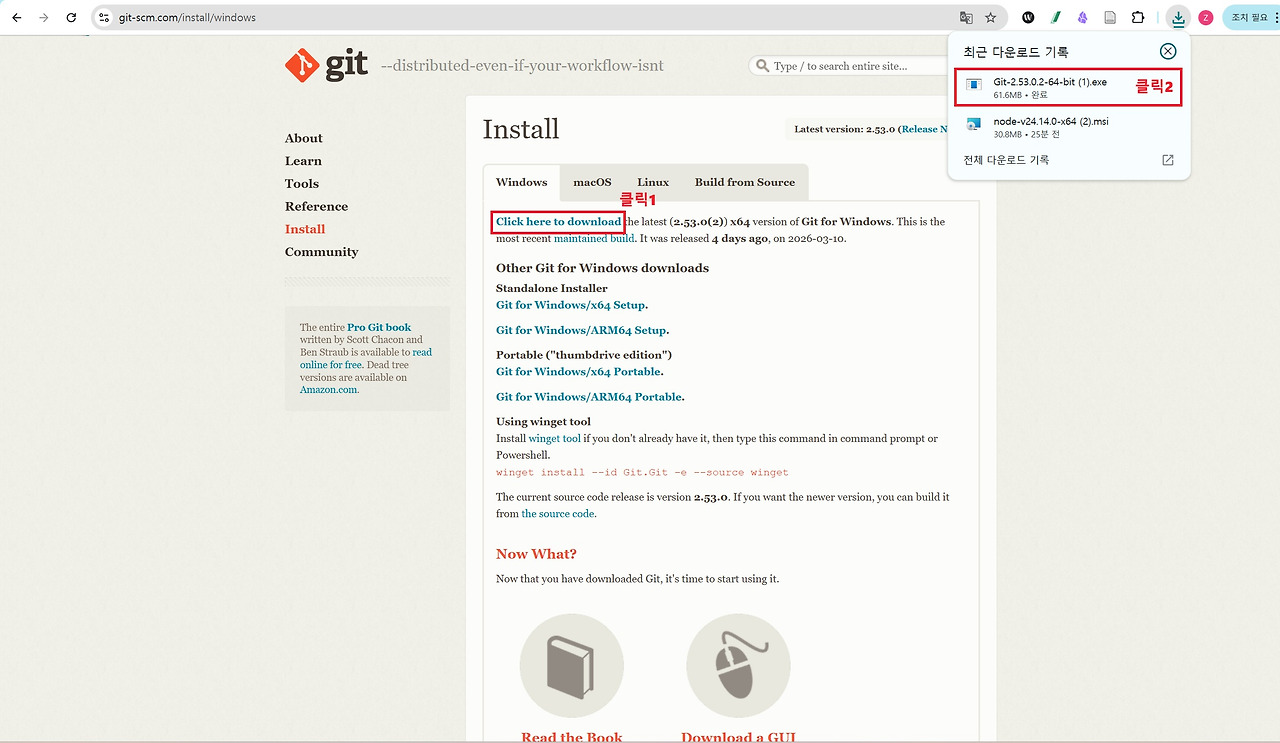 해당 명령어를 실행했을 때 Git 버전이 표시되면 정상적으로 설치가 완료된 것입니다. 이처럼 Node.js와 Git의 버전이 정상적으로 출력되면 Claude Code를 실행하기 위한 기본 개발 환경이 준비된 것입니다.