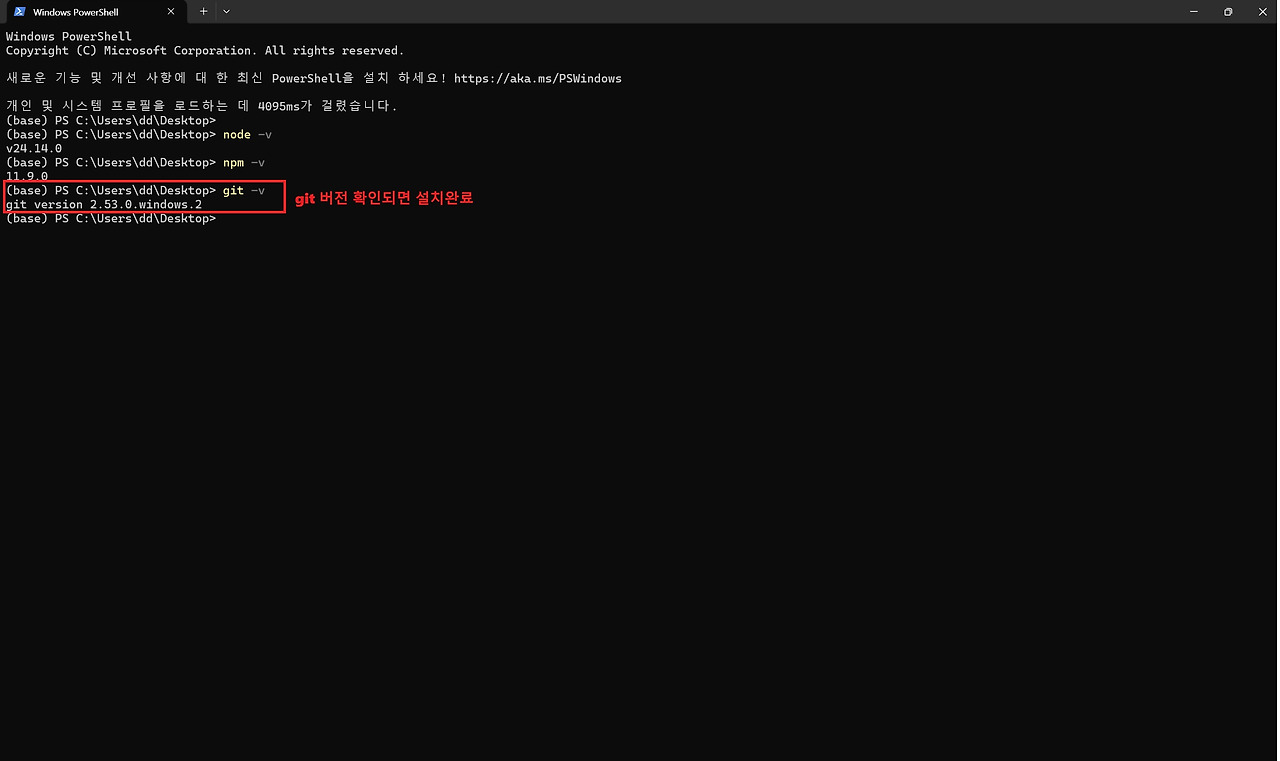 위 명령어를 실행했을 때 Node.js와 npm의 버전 번호가 출력되면 정상적으로 설치된 것입니다. Git 설치 여부는 다음 명령어로 확인할 수 있습니다.