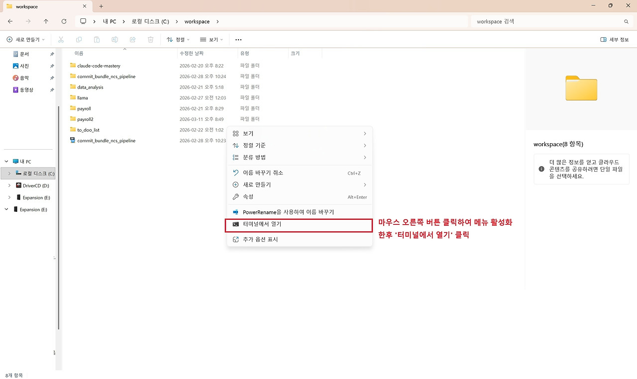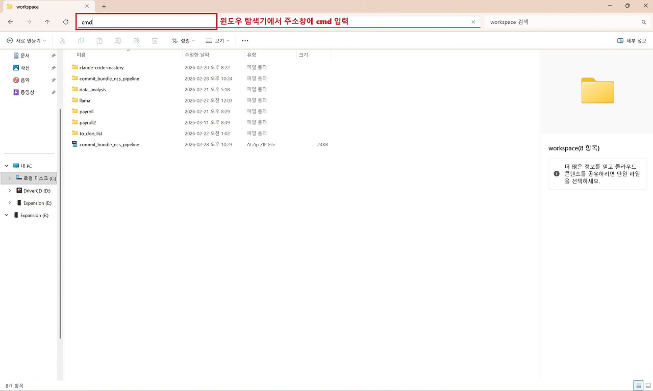 가장 간단한 방법은 Windows 탐색기에서 바로 터미널을 실행하는 방법입니다. 이 방법은 특정 프로젝트 폴더에서 바로 터미널을 열 수 있기 때문에 매우 편리합니다. 먼저 프로젝트 작업을 진행할 폴더를 엽니다. 예를 들어 저의 경우 'workspace' 폴더를 작업 폴더로 사용하고 있습니다. 그다음 폴더 내부의 빈 공간에서 마우스 오른쪽 버튼을 클릭합니다. 그러면 여러 메뉴가 나타나는데, 여기서 “터미널에서 열기” 메뉴를 선택하면 해당 폴더 경로에서 바로 터미널이 실행됩니다. 이 방법을 사용하면 별도 터미널 상에서 'cd' 명령어를 통해 폴더 이동을 하지 않아도 되기 때문에 작업 환경을 빠르게 시작할 수 있습니다. 또 다른 방법으로는 주소창을 이용하는 방법입니다. Windows 탐색기의 주소창을 클릭한 뒤 'cmd'라고 입력하고 Enter를 누르면 해당 폴더 경로에서 바로 Command Prompt가 실행됩니다. 이 방법 역시 현재 폴더를 기준으로 터미널이 실행되기 때문에 프로젝트 작업을 시작할 때 매우 유용합니다.