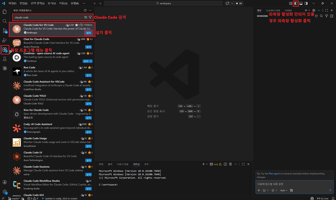 VS code 확장 Claude Code 프로그램 설치 방법은 간단합니다. 좌측창이 활성화되어 있지 않은 경우 우측 상단에 있는 창 활성화 아이콘 중 좌측창 활성화 아이콘을 클릭하여 창을 활성화합니다. 그 이후에는 Claude를 검색해서 'Claude Code for VS Code' 프로그램 오른쪽에 표시되어 있는 [설치]를 클릭하고 확장 프로그램을 설치합니다. 확장 프로그램이 설치된 경우 오른쪽 창을 활성화 할 경우 'ClaudeCode'가 활성화 화된 것을 확인할 수 있습니다. 해당 탭을 클릭하면 우측창에 Claude Code VS code 확장 프로그램이 활성화됩니다.