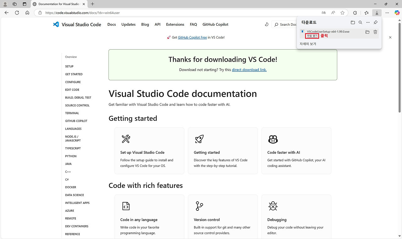 Claude Code는 터미널 상에서 직접 실행해도 되지만, 좀 더 GUI를 활용하며 활용하기 위해서는 VS Code를 활용하면 더 편리하게 사용할 수 있습니다. 따라서 VS Code를 먼저 설치하고자 합니다.