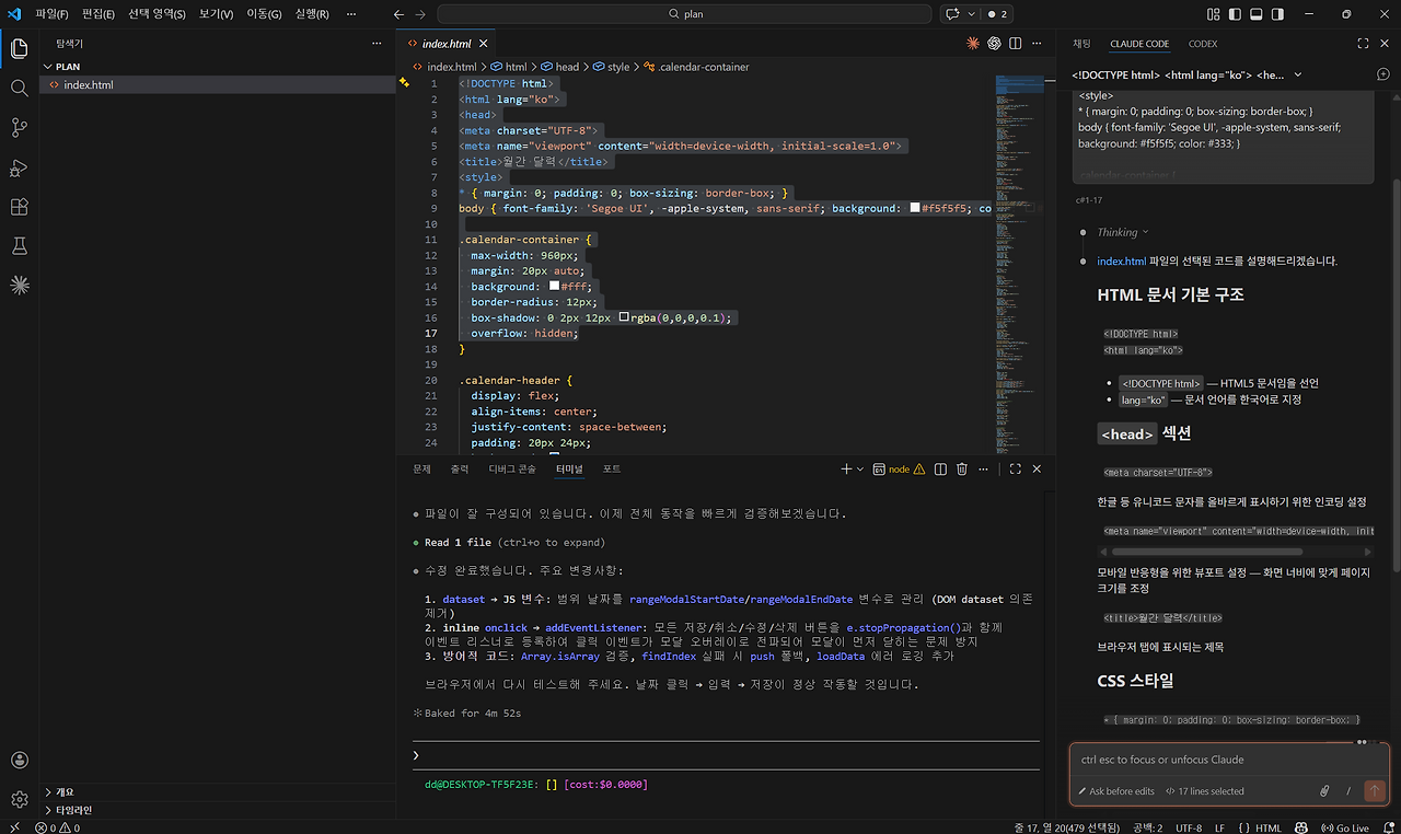 Cluade Code 확장 프로그램의 장점은 하단 이미지와 같이 프로젝트 내 파일을 직접 클릭하여 각 파일의 코드를 직접 보며 수정, 보완할 수 있다는 장점을 가지고 있습니다. 또한 하단 터미널에 활성화된 Claude Code CLI 버전과 함께 활용할 수 있어서 큰 작업은 터미널로 시행하되, 각 프로그램 파일별 세부적인 내용을 세밀하게 보완하고 싶은 경우 확장 프로그램을 통해 보완하면 효율적으로 Claude Code를 사용할 수 있습니다.