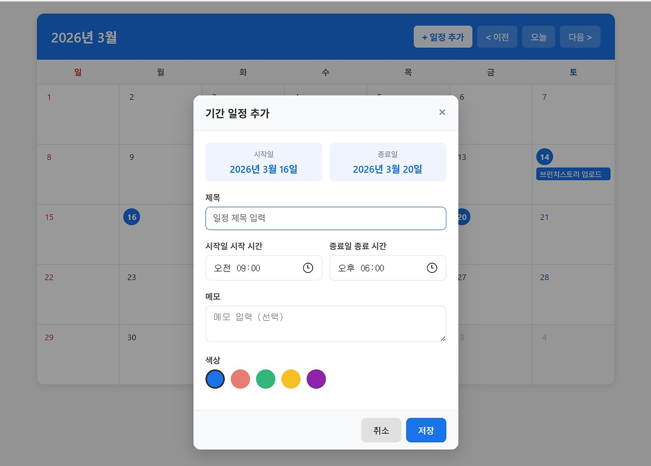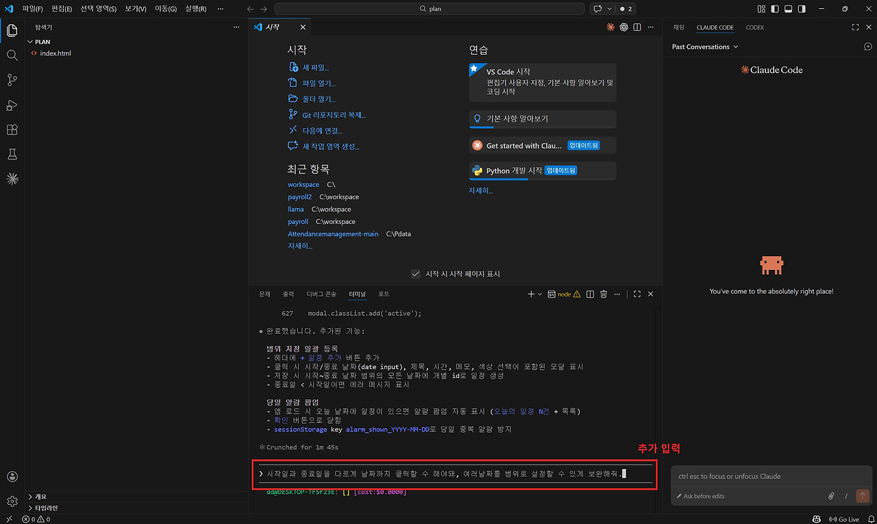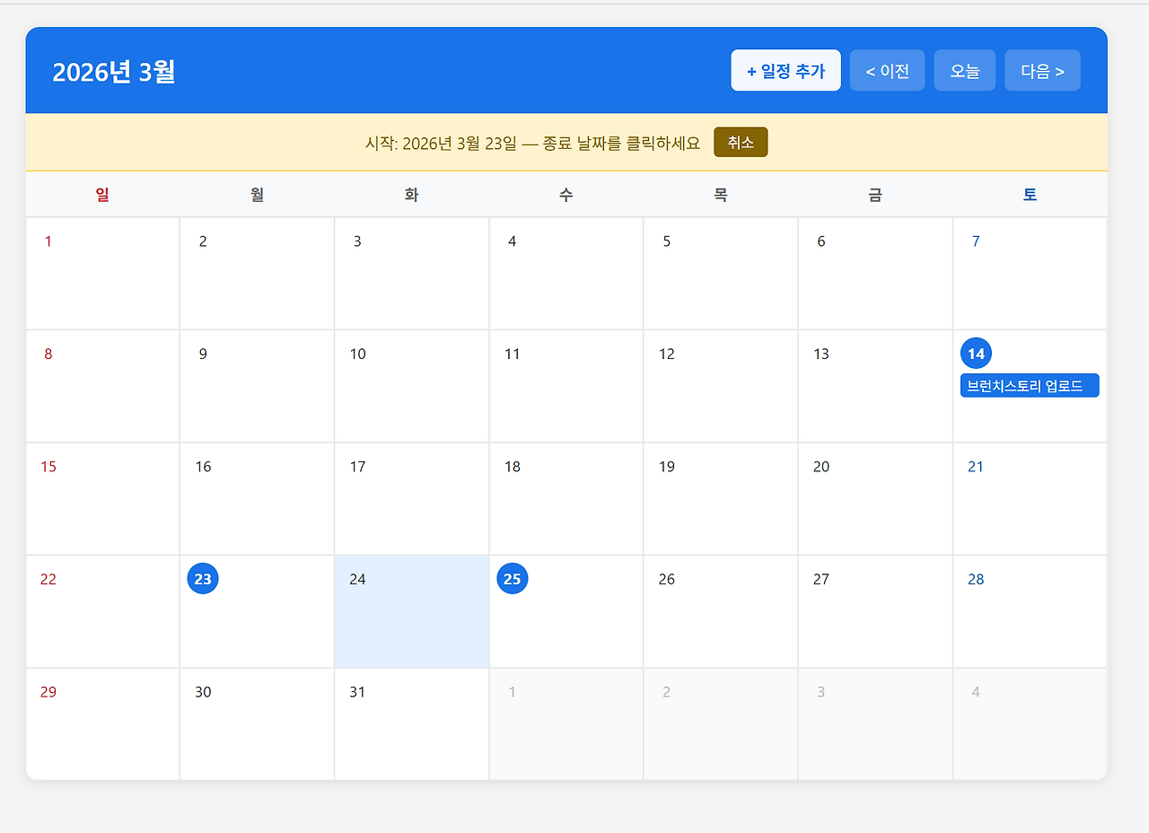 Claude Code가 코드를 수정한 뒤 프로그램을 다시 실행해 보니, 이제 시작일과 종료일을 선택하면 일정 입력 팝업 창이 정상적으로 활성화되고 해당 기간 전체에 동일한 일정이 자동으로 적용되는 것을 확인할 수 있었습니다. 이처럼 Claude Code는 텍스트뿐 아니라 이미지 기반으로도 문제 상황을 이해하고 코드 수정에 활용할 수 있습니다.