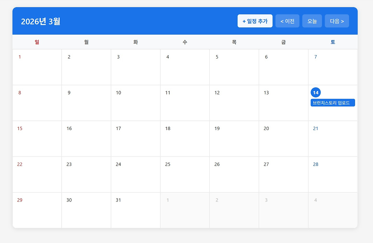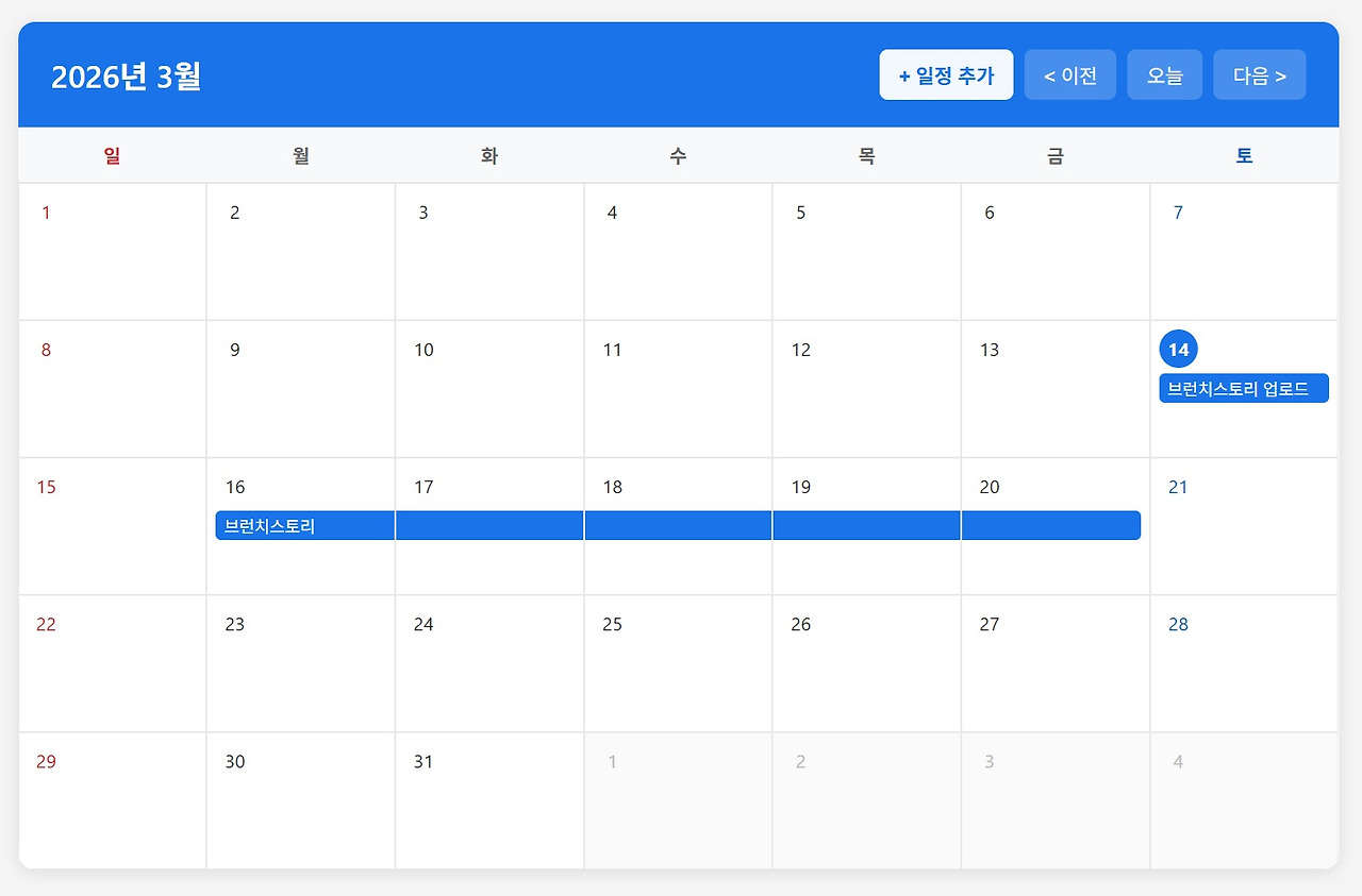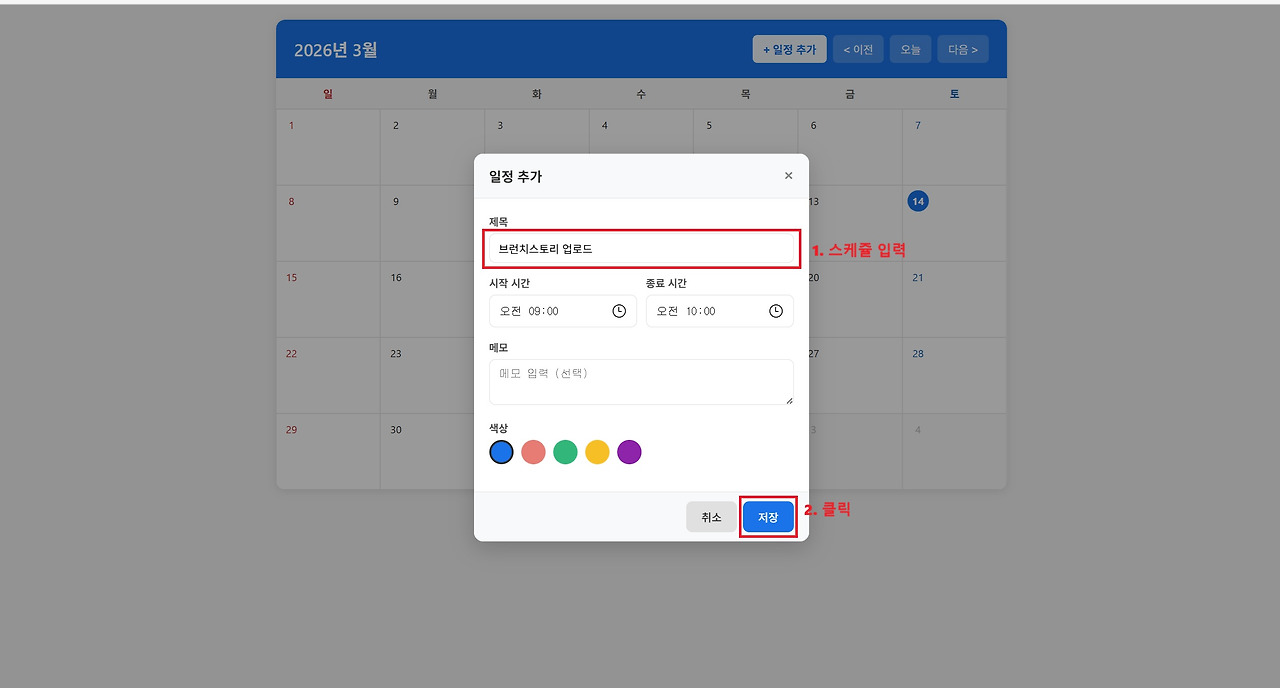 Claude Code가 코드를 수정한 뒤 프로그램을 다시 실행해 보니, 이제 시작일과 종료일을 선택하면 일정 입력 팝업 창이 정상적으로 활성화되고 해당 기간 전체에 동일한 일정이 자동으로 적용되는 것을 확인할 수 있었습니다. 이처럼 Claude Code는 텍스트뿐 아니라 이미지 기반으로도 문제 상황을 이해하고 코드 수정에 활용할 수 있습니다.