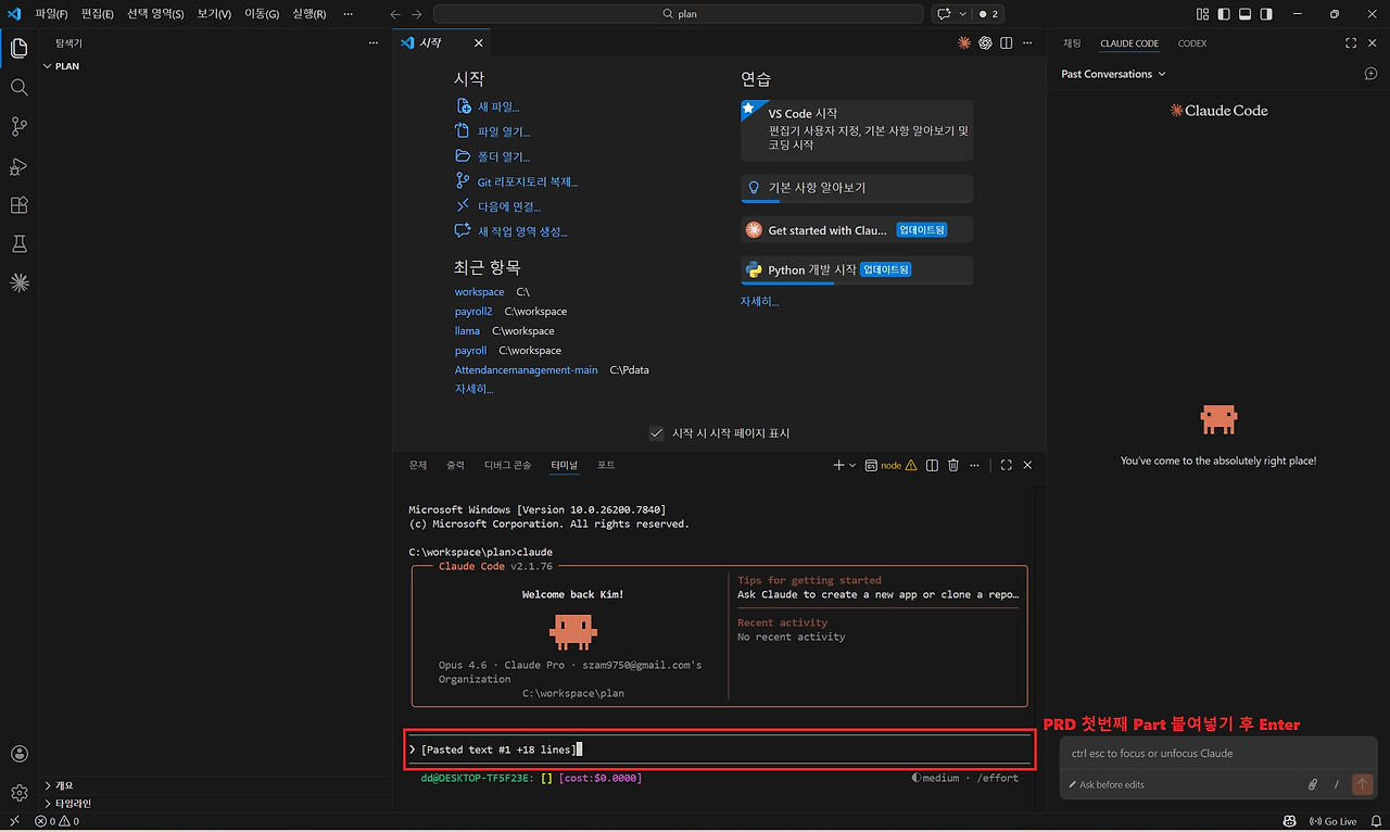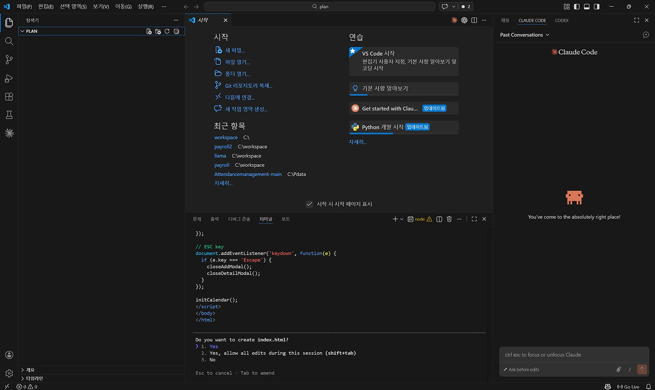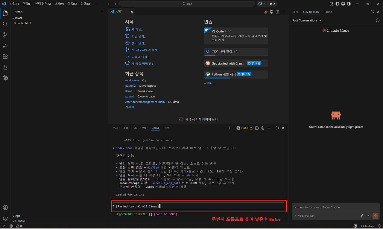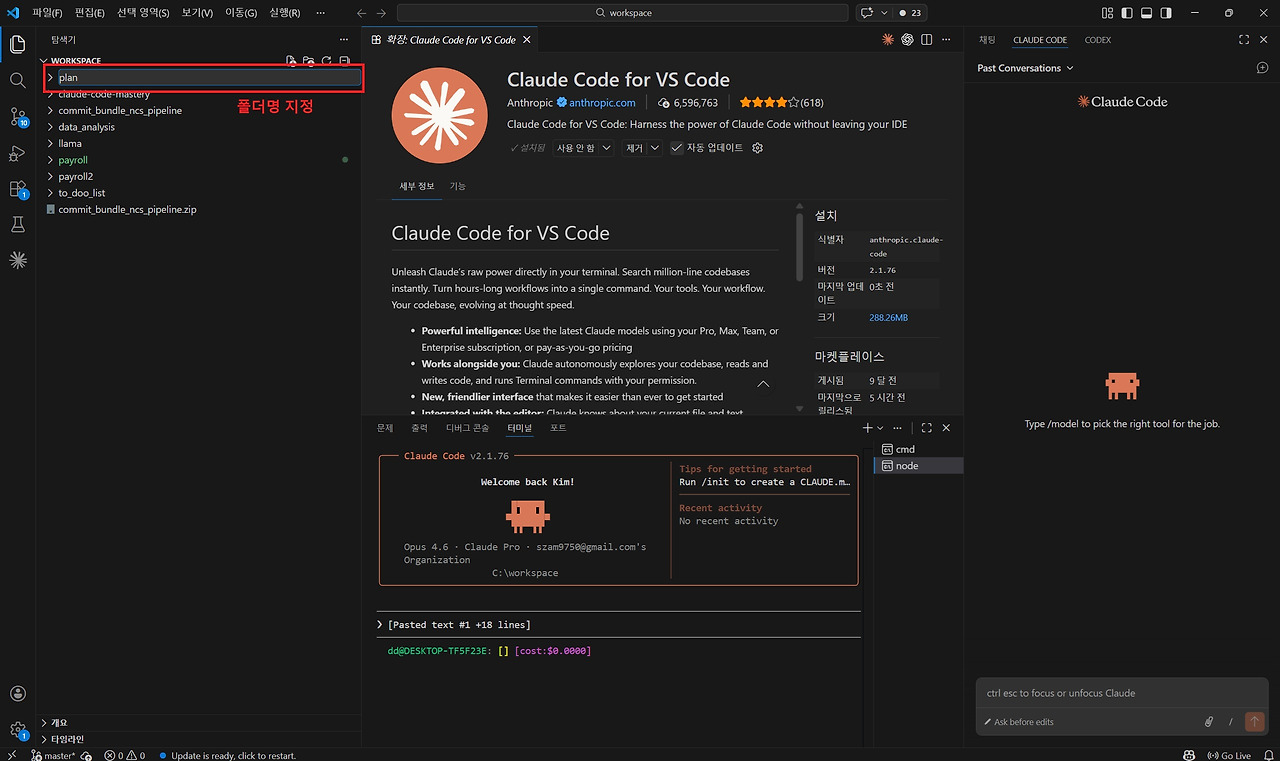 여기서는 예제 프로그램을 만들기 위해 'plan'이라는 이름의 프로젝트 폴더를 생성하겠습니다. 폴더 이름을 입력한 뒤 Enter를 누르면 'workspace' 폴더 안에 'plan'이라는 새로운 프로젝트 폴더가 생성됩니다. 이제 해당 폴더가 Claude Code로 프로그램을 개발할 프로젝트 작업 공간이 됩니다. 마지막으로 VS Code 상단 메뉴에서 다시 [파일] → [폴더 열기]를 클릭한 뒤 방금 생성한 plan 폴더를 선택하여 프로젝트 폴더를 활성화합니다.