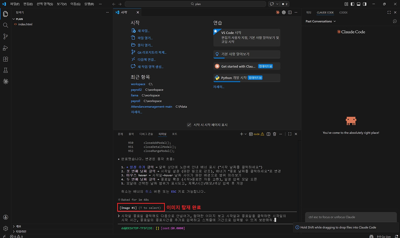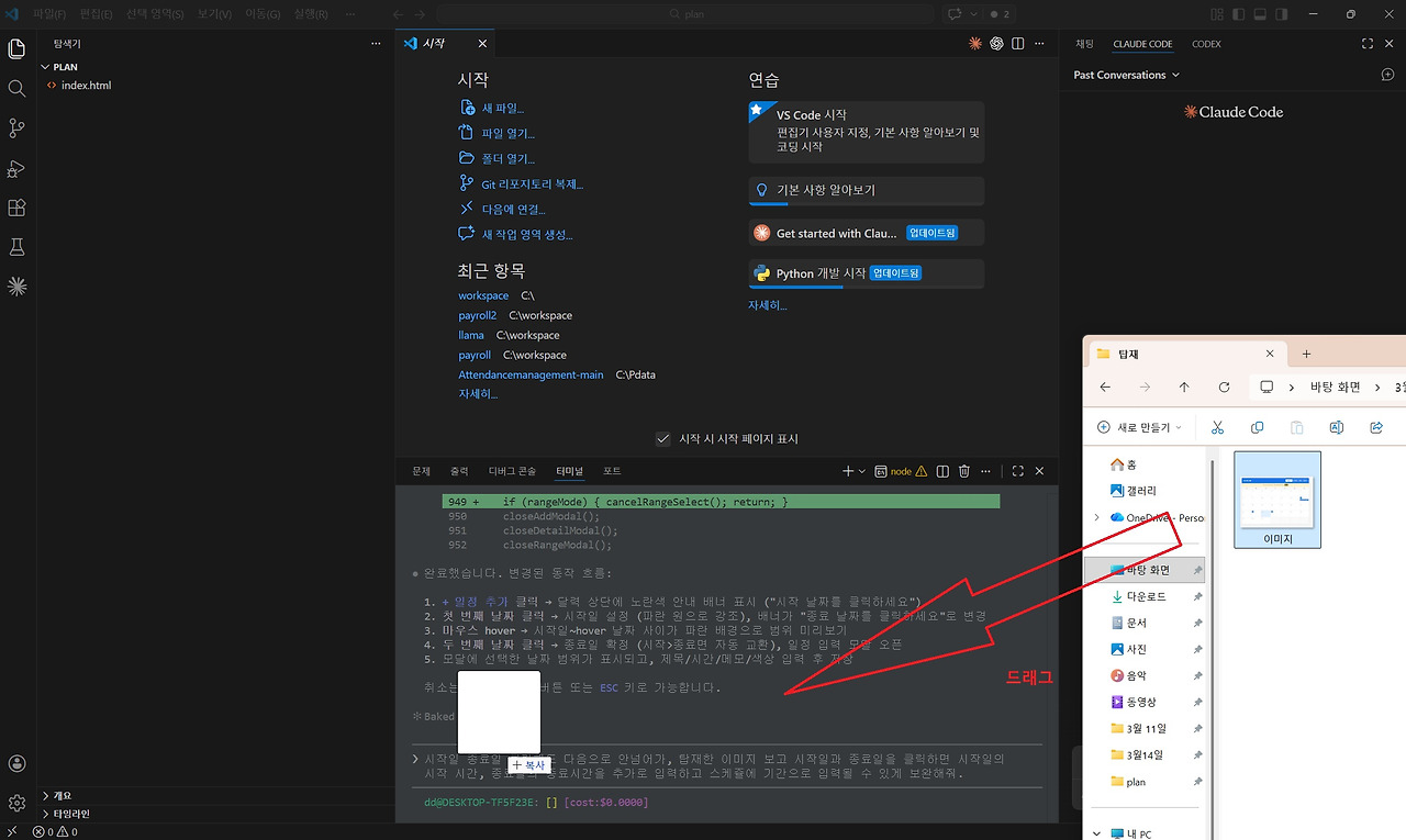 3️⃣ 해당 이미지를 Claude Code 창으로 드래그하여 업로드합니다.