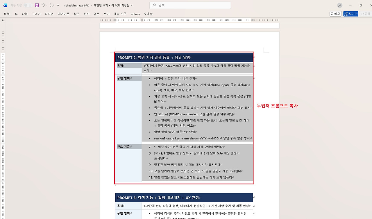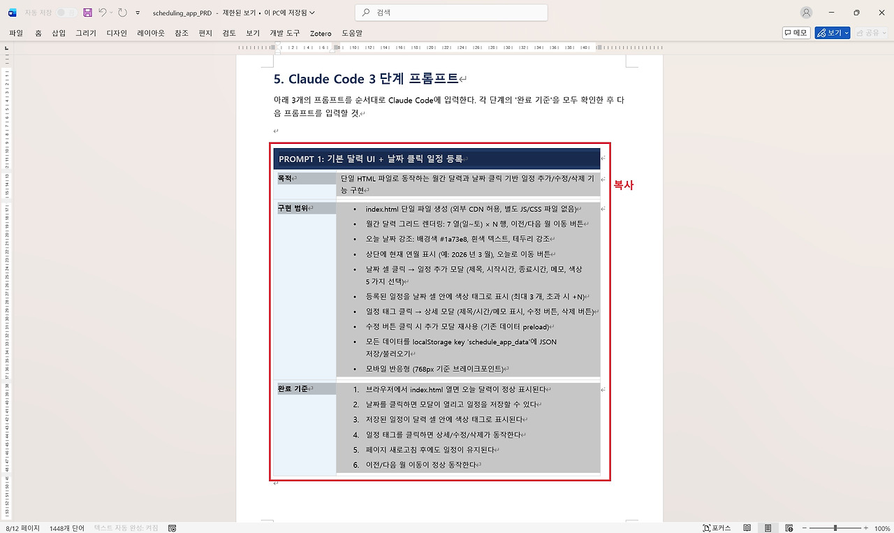 프롬프트를 입력하니 Claude Code에게 3번에 거쳐서 입력할 수 있도록 PRD 파일을 작성해 주었습니다. PRD 파일이 아니라 직접 제공하는 경우에는 직접 복사해서 바로 Claude Code로 프롬프트를 전달해 주면 됩니다. 이번의 경우에는 파일로 작성을 해주었으므로, '다운로드'를 클릭하여 PRD 워드파일을 다운로드 받고 워드파일을 실행하여 1단계부터 3단계까지 단계별 프롬프트를 순서대로 Claude Code에 입력하여 프로그램 개발을 진행하였습니다.