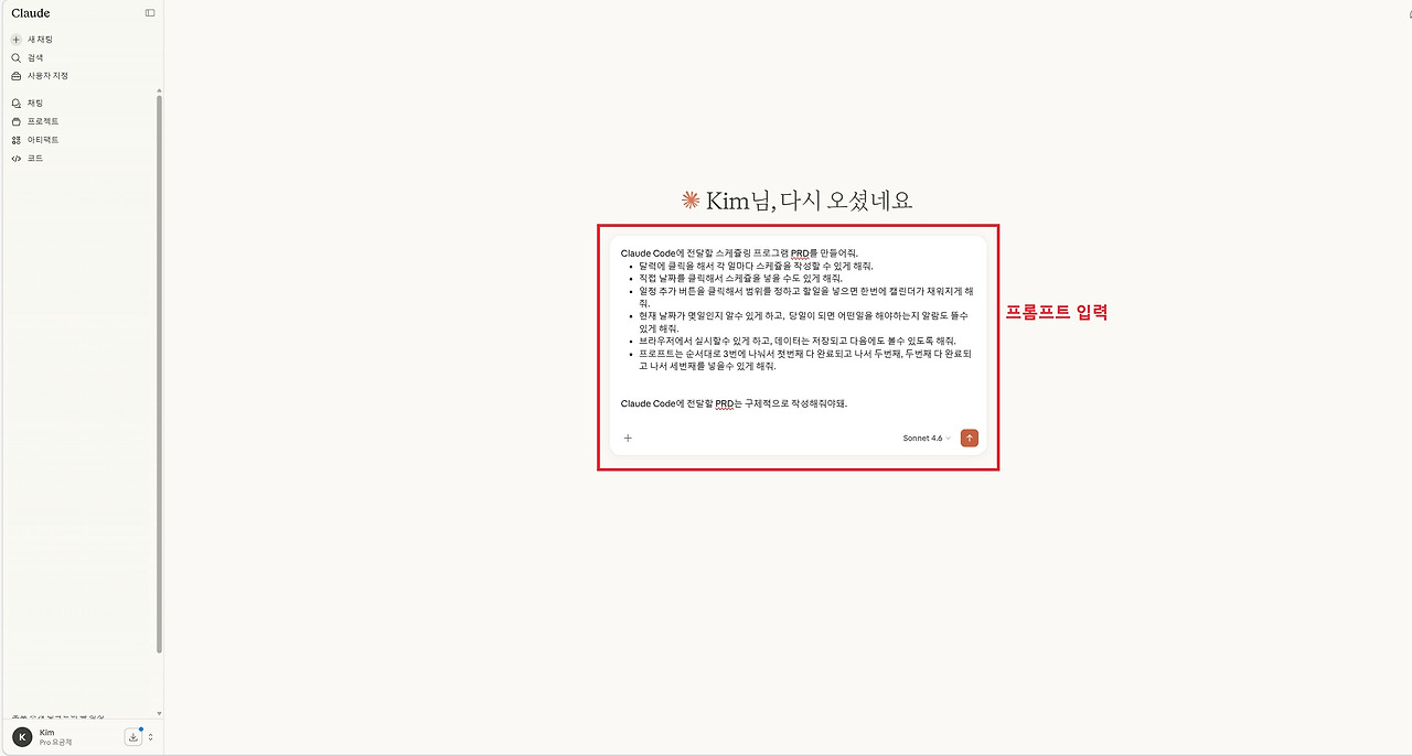 이제 스케줄을 기록하기 위한 프로그램을 만들어 보겠습니다. 모든 프로그램 개발에서는 개발의 방향성과 일관성을 확보하기 위해 PRD(Product Requirement Document)를 작성하는 것이 중요합니다. PRD는 프로그램이 어떤 기능을 가져야 하는지, 어떤 방식으로 동작해야 하는지를 정리한 개발 설계 문서라고 볼 수 있습니다. 저는 웹 버전 Claude에게 아래와 같은 프롬프트를 전달하여 PRD 작성을 요청했습니다.