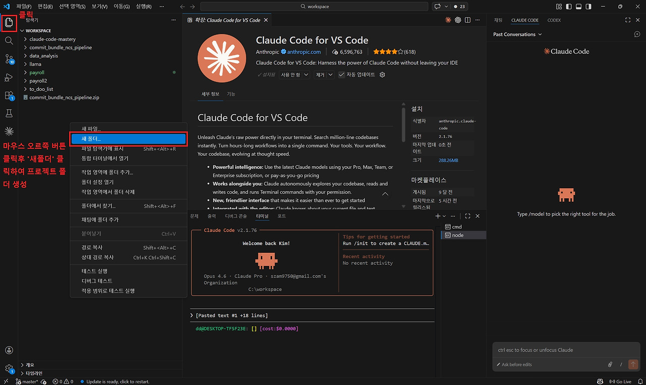 이제, Claude Code를 활용하여 간단한 프로그램을 직접 개발해 보겠습니다. 먼저 VS Code에서 프로그램을 개발할 프로젝트 폴더를 생성해야 합니다. 저의 경우 여러 프로젝트를 관리하기 위해 'workspace'라는 폴더를 사용하고 있습니다.