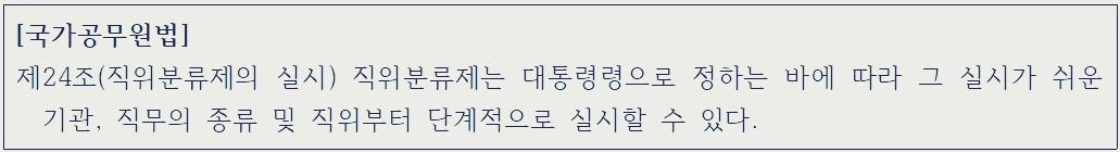 우리나라 정부조직과 공공기관 인사시스템(공직분류구조)은 계급제를 원칙으로 하고 있습니다. 그러나 최근 정부조직과 공공기관 모두 조직구성원의 전문성을 강화하기 위한 수단으로 직위분류제적 성격을 강화하고 있습니다. 현 정부의 국정과제에도 인사혁신처는 직무중심의 공정한 인사시스템 확립과 소신껏 일할 수 있는 여건 조성 등으로 일 잘하는 정부조직 구현을 강조하고 있으며, 기획재정부는 공공기관을 대상으로 직무중심 보수‧인사‧조직관리 확대를 강조하고 있습니다(제20대 대통력직인수위원회, 2022).