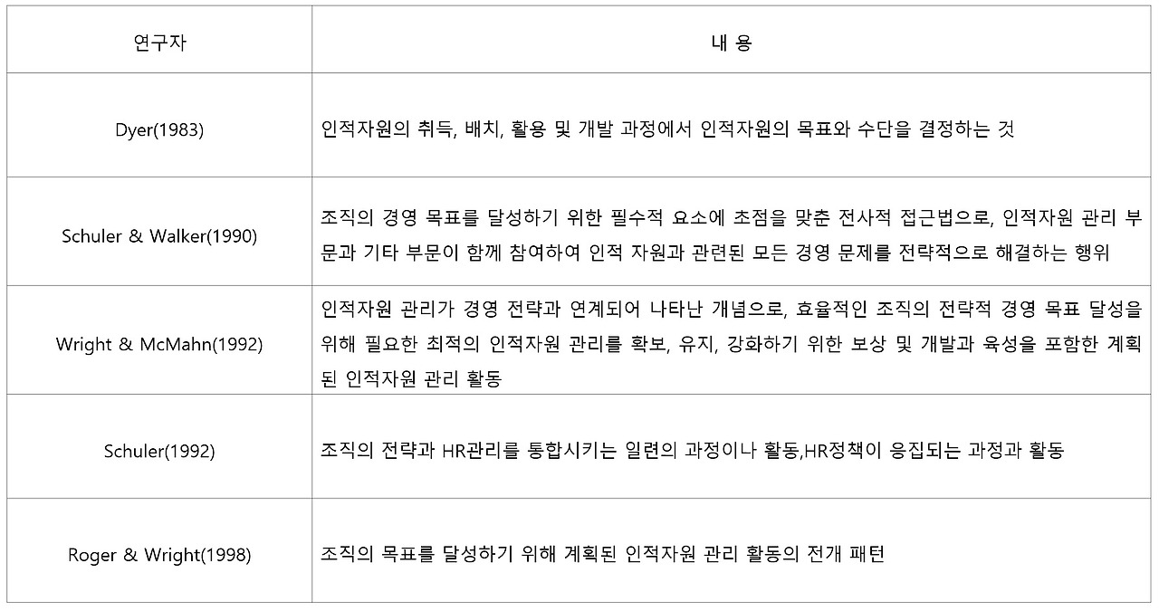 전략적 인적자원관리(Strategic Human Resource Management, SHRM)는 인적자원관리를 조직 전략과 통합·연계하여 성과 향상을 도모하는 개념입니다. 따라서 전략적 인적자원관리는 조직의 비전 및 목표, 조직 내부 상황, 외부 환경을 종합적으로 고려하여 인적 자본을 확보, 개발, 활용함으로써 조직의 목표를 최대한 달성하려 합니다. 전략적 인적자원관리에 대한 정의는 학자에 따라 조금씩 다르게 제시됩니다. 대표적인 학자들의 전략적 인적자원관리에 대한 정의를 살펴보면 다음과 같습니다.
