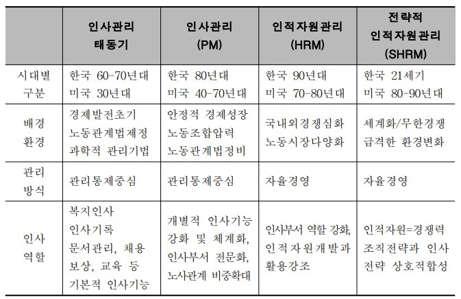 인적자원관리는 조직 내 인력을 관리하고 발전시키는 제도와 기법을 의미합니다. 인사관리 태동기와 인사관리(PM) 시기에서는 노동력을 생산요소 중 하나로 간주하고, 통제. 관리 중심의 인사관리를 수행하였습니다. 그러나 1990년대 이후 인적자원관리(HRM) 시기가 도래하면서 인력 개발과 활용에 더 중점을 두기 시작하였으며 21세기에 들어서는 전략적 인적자원관리(SHRM)를 통해 조직 전략과 연계된 인적자원관리가 이루어지기 시작하였습니다. 이에 대한 시기별 특성은 다음과 같습니다.