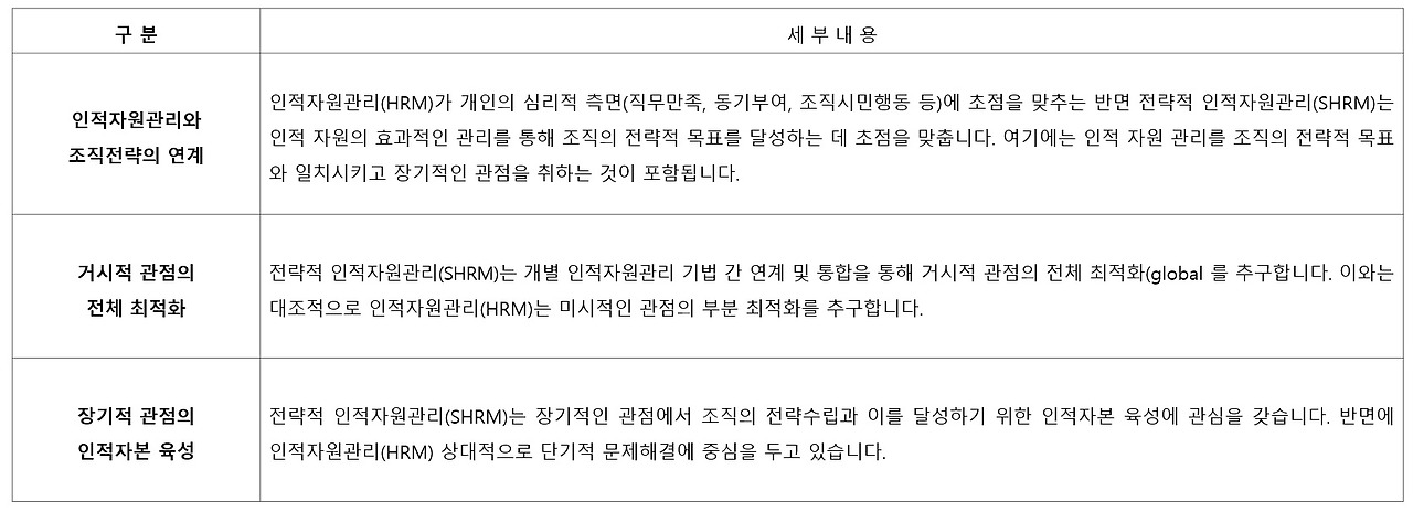 기존 인적자원관리와 차별화되는 전략적 인적자원관리의 특성을 살펴보면 다음과 같습니다. 전략적 인적자원관리는 조직 전략과 연계하여 거시적이고 장기적 관점에서 인사관리를 실행합니다. 또한 조직 내 구성원을 단순한 비용 요소로 보지 않고, 인적자본의 관점에서 투자하여 육성해야 할 대상으로 바라봅니다. 아래 표는 전략적 인적자원관리의 특징을 정리한 표입니다.