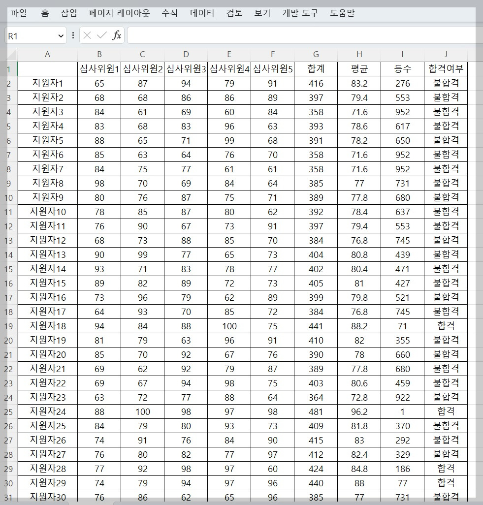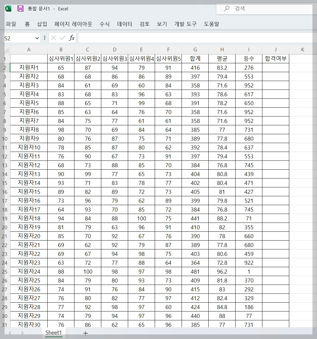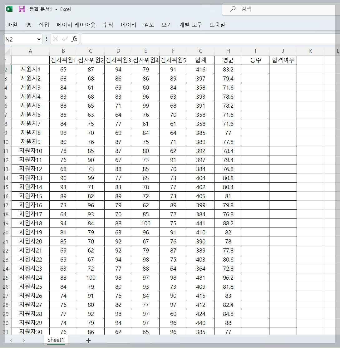 첫 번째로, 채용 업무(또는 기타 평가 업무)에서 와 Chat GPT와 VBA 코드를 사용하여 합계 점수, 평균 점수, 등수, 합격 여부를 계산하는 방법을 소개하겠습니다.