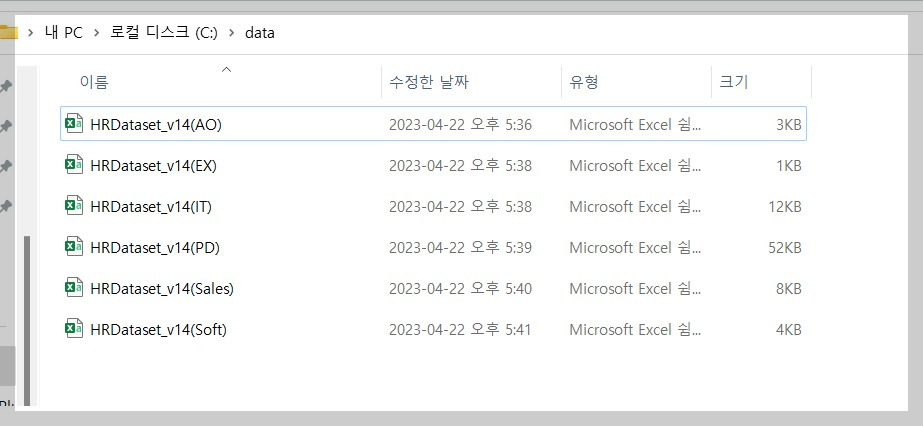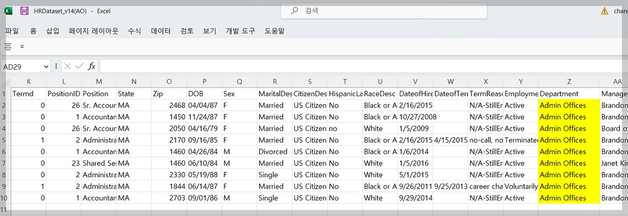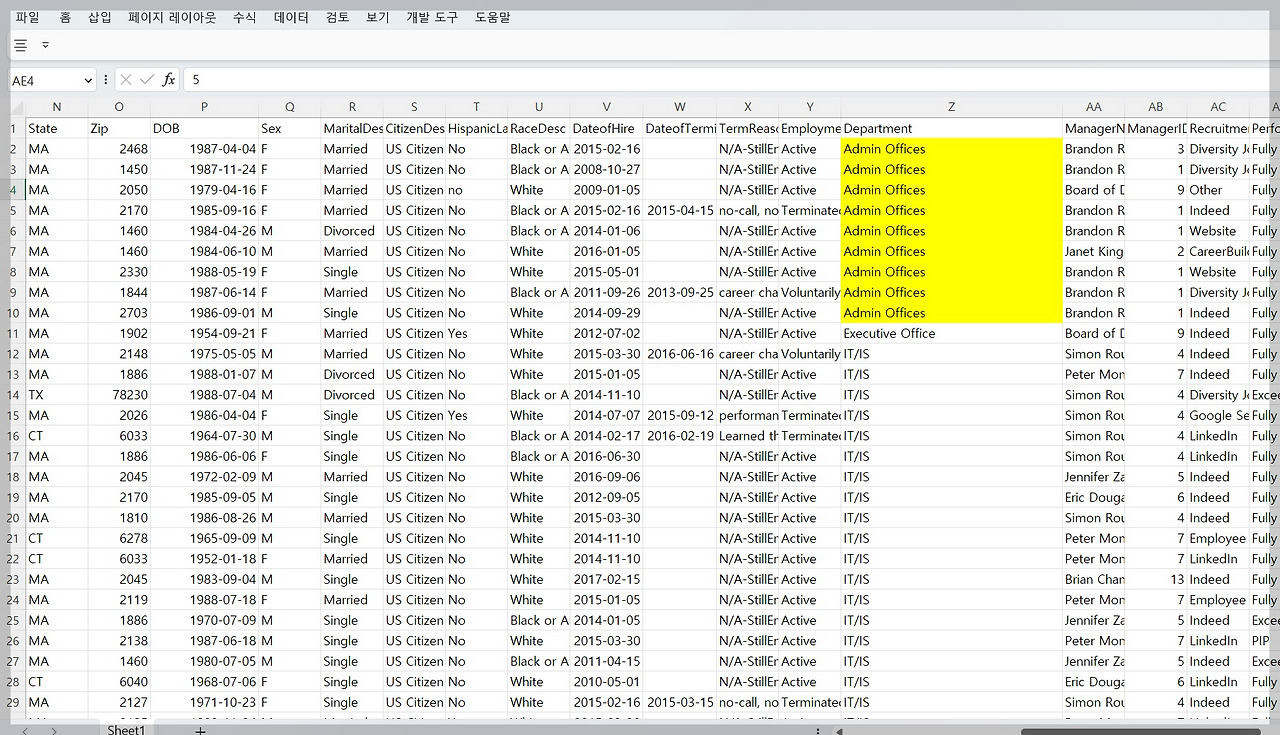 (좌) 특정 폴더에 있는 부서별 작성 자료들, (우) Admin Offices 부서의 인적 정보 예시