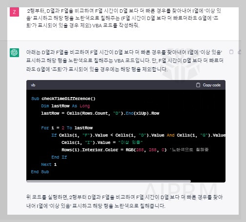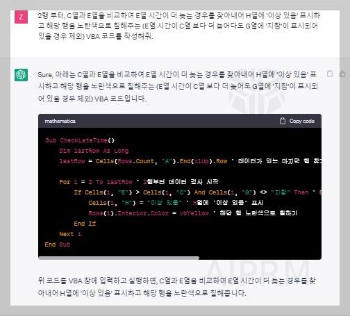 근무자가 실제 출퇴근 기록과 복무 신청 내역이 일치하는지 검토하고 이상이 있을 경우 이를 표시하고 담당자가 빠르게 찾을 수 있도록 Chat GPT에게 코드를 요청하여 VBA 코드를 받았습니다. 해당 코드를 엑셀 VBA에 입력한 결과, 출근 시간과 퇴근 시간에 이상이 있는 경우 그 내역이 별도로 표시되어 복무담당자가 이를 쉽게 확인할 수 있게 되었습니다.