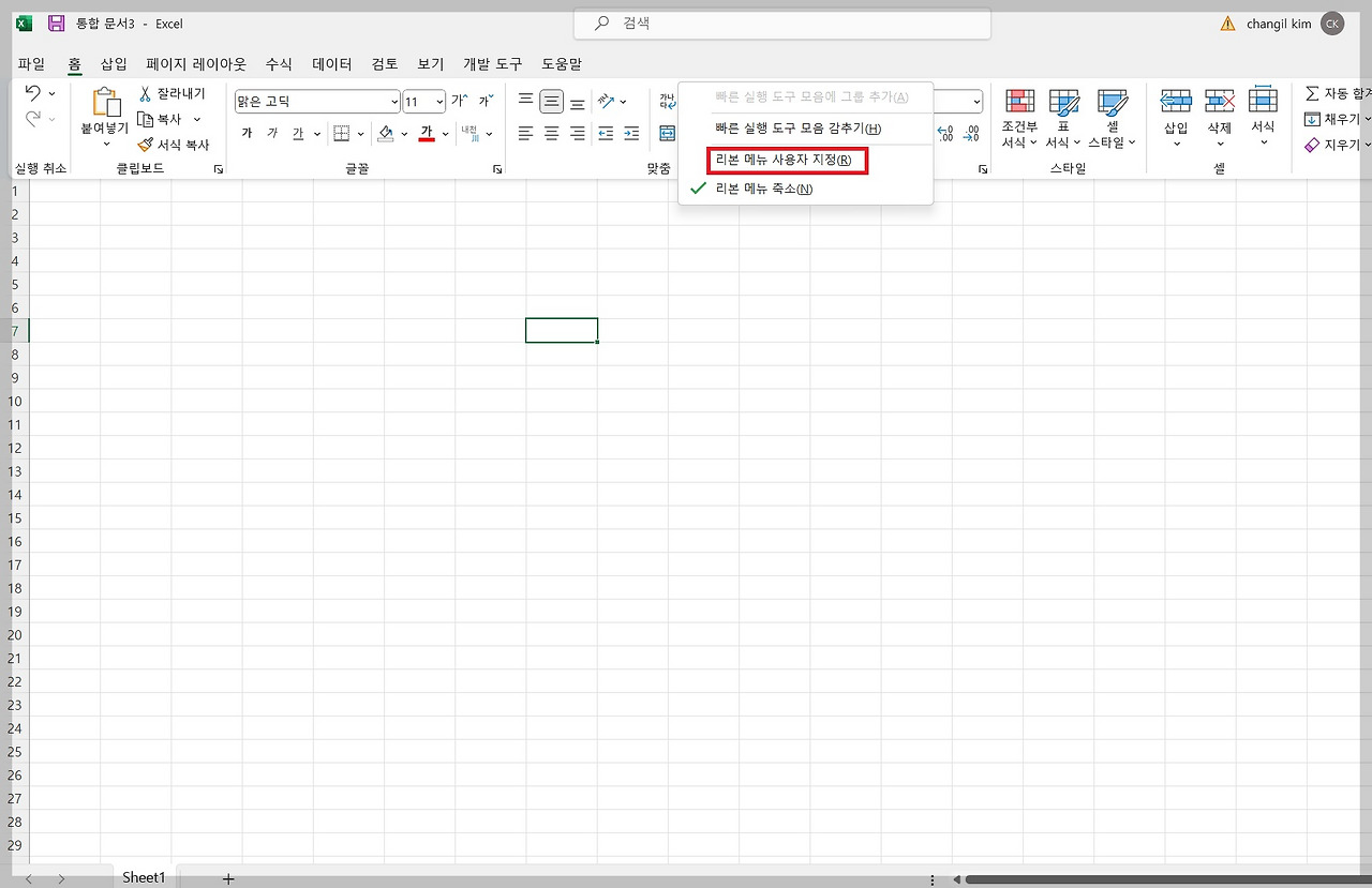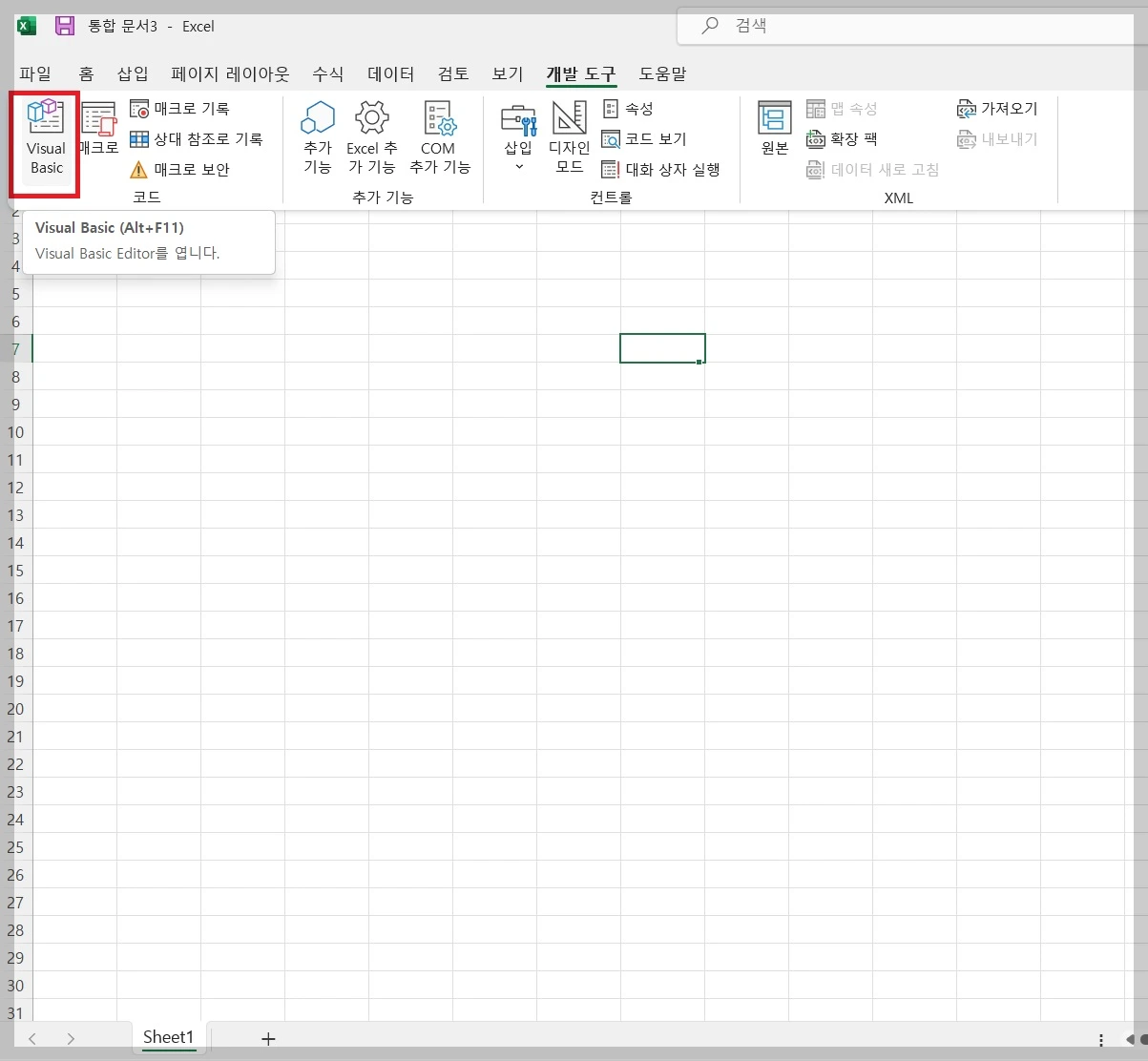 Excel에서 VBA 코드를 작성하는 방법은 다음과 같습니다. 먼저, 엑셀을 실행한 후, 상단 메뉴에서 [개발도구] - [Visual Basic]을 클릭합니다. 만약 상단 메뉴 칸에 [개발도구]가 보이지 않는다면, 홈 메뉴에서 마우스 오른쪽 버튼을 클릭하여 [리본 메뉴 사용자 지정]을 선택하고, [리본 사용자 지정] 탭에서 개발도구를 활성화합니다.