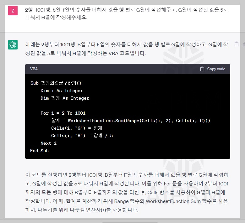 다음으로는 각 심사위원 점수의 합계와 평균 점수를 작성하는 VBA 코드를 Chat GPT에게 물어보았더니 아래와 같이 VBA 코드를 도출해 줍니다. 도출 VBA 코드는 위에서 설명한 것과 동일하게 Chat GPT가 재시해 준 코드 오른쪽 위 [Copy code]를 클릭한 후 해당 코드를 Excel의 Visual Basic에 붙여 실행하면 됩니다.