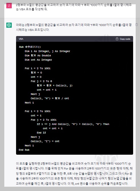 이후에는 평균 점수를 기준으로 1,000명의 지원자의 순위를 도출하는 VBA 코드를 Chat GPT에 요청하여 받고 이를 엑셀 VBA에 입력하였습니다. 엑셀 VBA 실행 결과로 평균 점수를 비교하여 지원자들의 순위가 도출되었습니다. 만약 VBA 코드를 입력하여 에러가 발생할 경우, 에러 메시지를 다시 Chat GPT에게 전달하면 Chat GPT가 해당 에러 메시지를 해결할 수 있는 방안을 다시 알려줍니다.