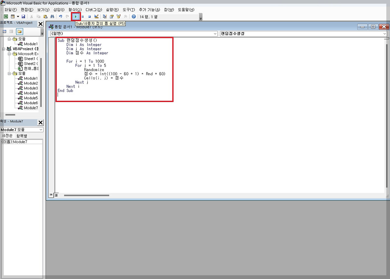 위 화면에서 볼 수 있는 바와 같이 코드를 붙여 넣기 한 후 위 삼각형 모양의 아이콘을 클릭(또는 F5)하면 실행됩니다.