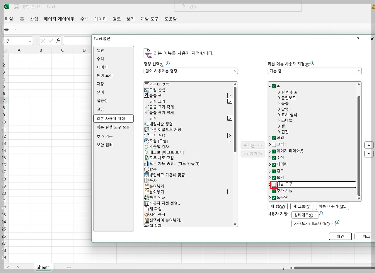 (좌) 리본 메뉴 사용자 지정을 클릭, (우) 개발도구 탭을 활성화 시키기