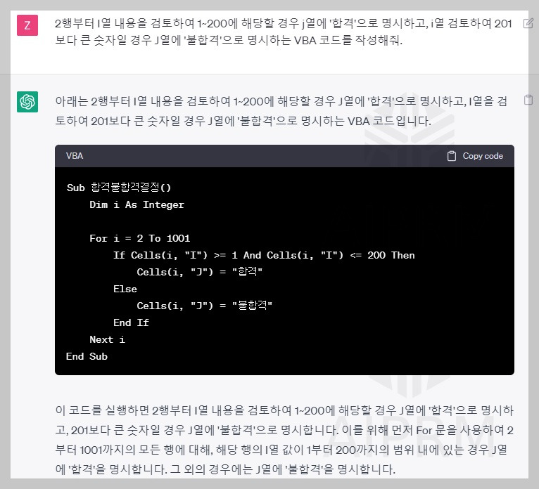 (좌) 합격 여부를 도출 VBA 코드를 알려주는 Chat GPT, (우) 실행 결과 도출된 합격 여부