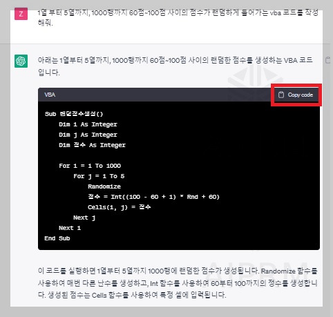 Chat GPT가 제공하는 VBA 코드를 보면 오른쪽 위에 [Copy code] 버튼이 있습니다. 이를 클릭하면 코드 내용이 임시 저장됩니다. 복사한 후 VBA 코드 입력 창에 Ctrl+V를 눌러 코드를 붙여 넣고, 상단에 있는 빨간색 표시된 삼각형 아이콘을 누르면 코드가 실행됩니다.