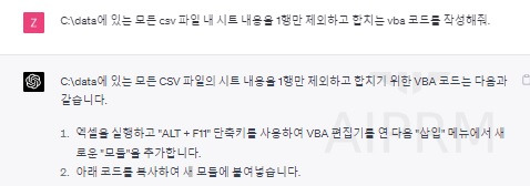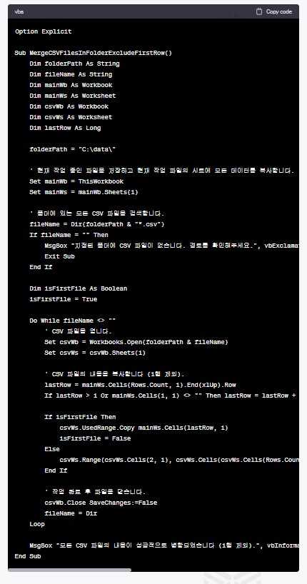 Chat GPT에게 각 부서에서 전송한 엑셀 파일이 위치한 폴더를 알려주고 해당 폴더에 있는 모든 파일의 시트 내용을 합쳐주는 VBA 코드를 작성해 달라고 요청했습니다. Chat GPT는 요청에 따라 엑셀 VBA 코드를 제시해 주었습니다. 이 코드를 실행하기 위해서는 새로운 엑셀 파일을 실행하고 엑셀 VBA 실행 창을 열어 코드를 입력하고 실행하면, 해당 엑셀 파일에 지정된 폴더에 있는 엑셀의 내용이 모두 합쳐집니다.