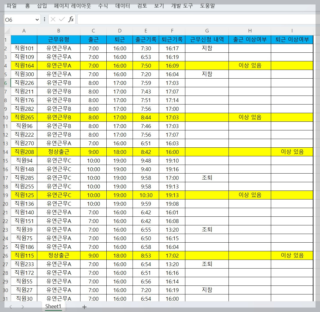 아래 사진은 VBA 코드를 입력하여 얻은 결과입니다. 먼저, 출근의 경우 [근무유형]을 통해 등록된 출근 시간보다 실제 출근 기록 시간이 늦는 경우 [출근 이상여부]에 '이상 있음'을 표시하며 해당 행을 노란색으로 채우도록 VBA 코드를 작성하였습니다. 하지만 해당 근무자가 지참을 정상적으로 신청하여 근무신청 내역에 '지참'이 있음을 확인한 경우에는 이상이 없는 것으로 판단하도록 코드를 구성하였습니다.