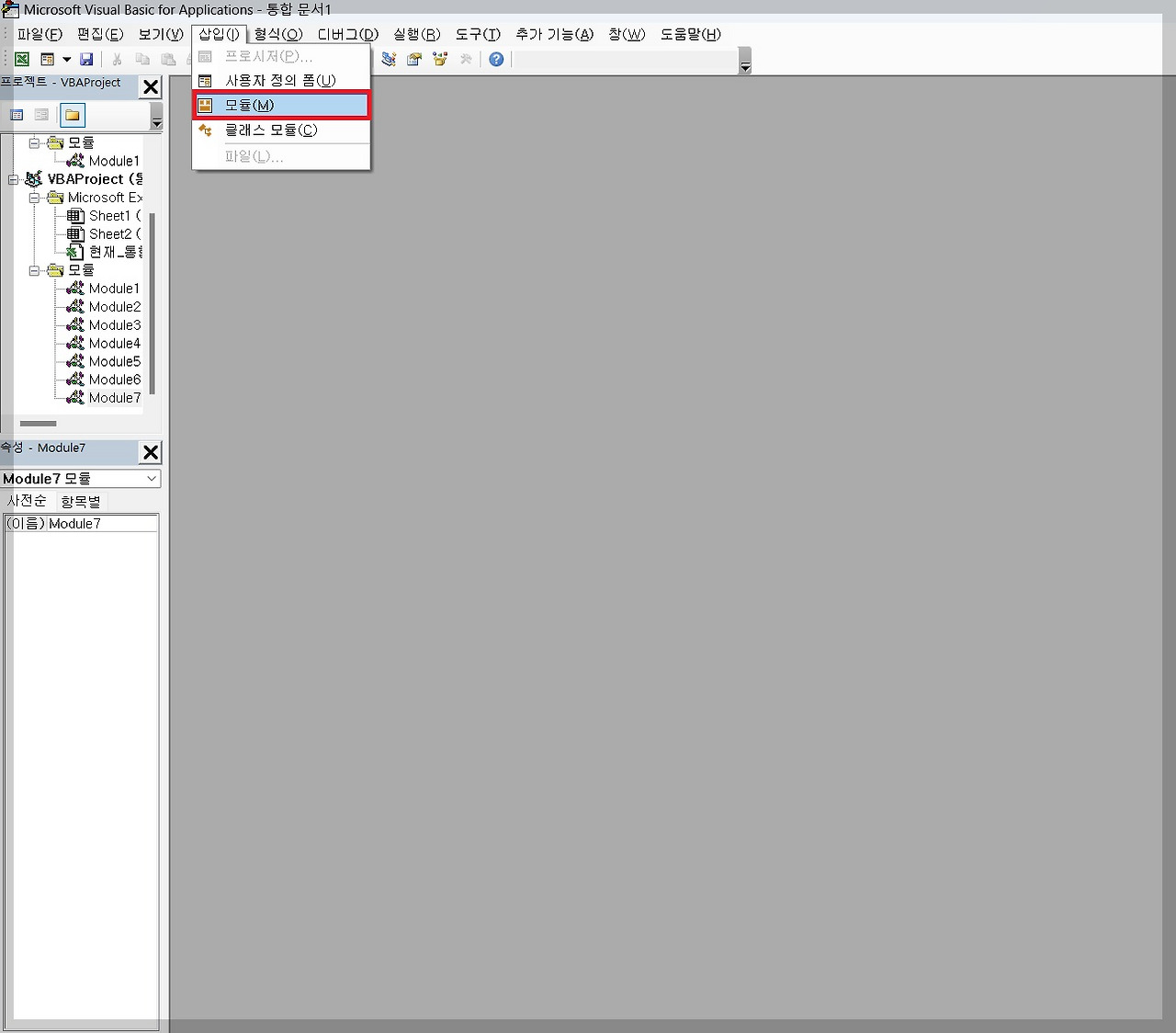 [개발 도구] 메뉴가 활성화되면, [개발 도구] 내 [Visual Basic] 메뉴를 클릭하여 VBA를 실행합니다. VBA가 실행되면 [삽입] - [모듈]을 클릭하여 VBA 코드를 입력할 창을 활성화합니다.