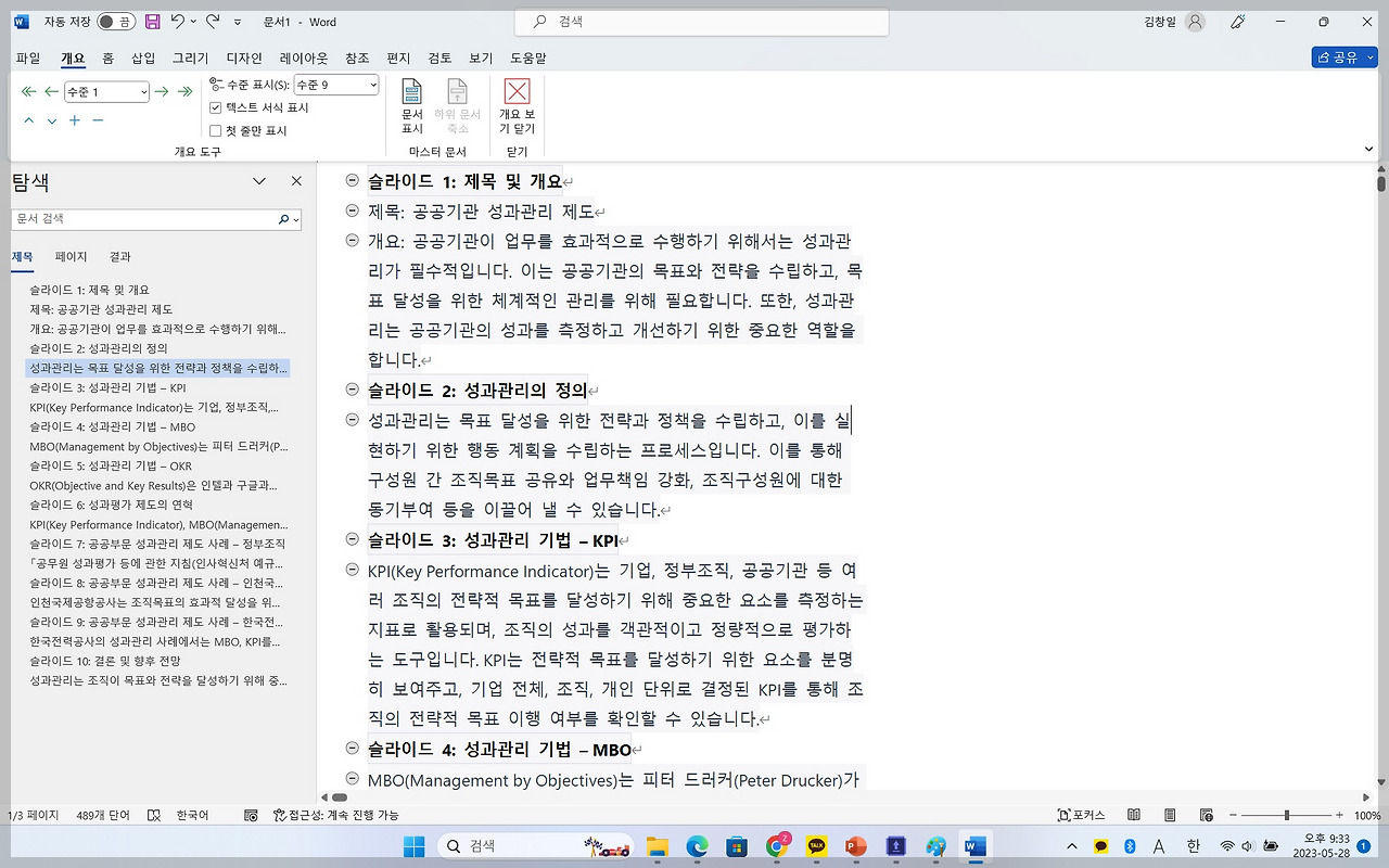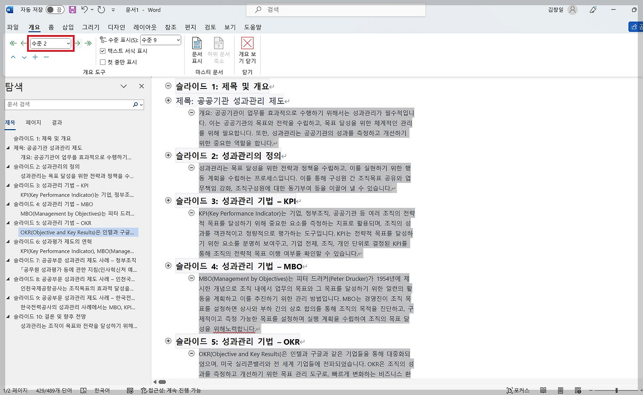 위의 화면을 보시면, Word 프로그램에 들어가서 개요 기능 실행하고 Chat GPT가 작성한 문서를 워드 개요 기능에 복사하였습니다. Word 개요에 복사한 후 각 텍스트에 대해 수준을 설정하였습니다. PPT 슬라이드 제목 수준에 해당하는 내용은 '수준 1'로, 슬라이드 본문 수준에 해당하는 내용은 '수준 2'로 설정하였습니다. 이와 같은 방식으로 단순 텍스트를 PPT 슬라이드 구조에 맞게 재구성할 수 있습니다.