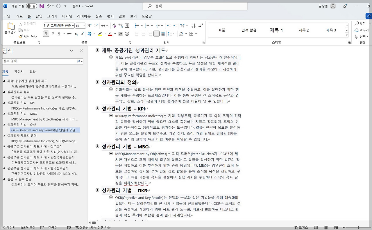 다음으로 PPT로 구성하고자 하는 내용을 워드 문서에 개요 형태로 작성하셔야 합니다. 워드 문서로 개요를 작성하면, PPT에 각각의 텍스트를 적절한 위치에 배치하는데 도움이 됩니다. Chat GPT에서 작성한 문서를 워드로 가져와 빠르게 구조화시키는 것은 이후 해당 글을 PPT 형식에 맞게 적용하기 위해 필요한 작업입니다.