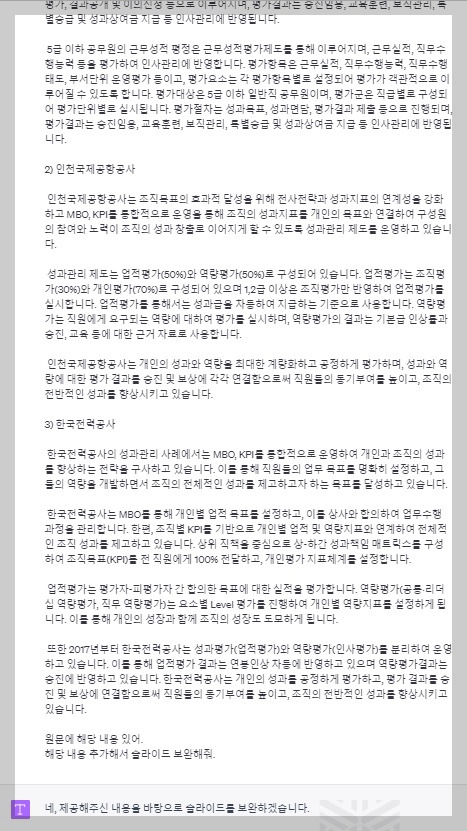 위의 캡처 화면에서도 보시다시피, 처음에 Chat GPT가 제공한 슬라이드 내용은 간결했습니다. 이에 사용자는 보다 구체적인 내용을 포함하도록 피드백을 주었고, 이후에도 예시 부분에 대한 내용이 부족하여 해당 부분을 Chat GPT에 다시 직접 입력하고 보완해 달라고 요청하였습니다. 이렇게 반복적인 피드백 과정을 거친 결과, 마지막 슬라이드에서는 내용이 어느 정도 충분히 포함된 것을 확인할 수 있었습니다.