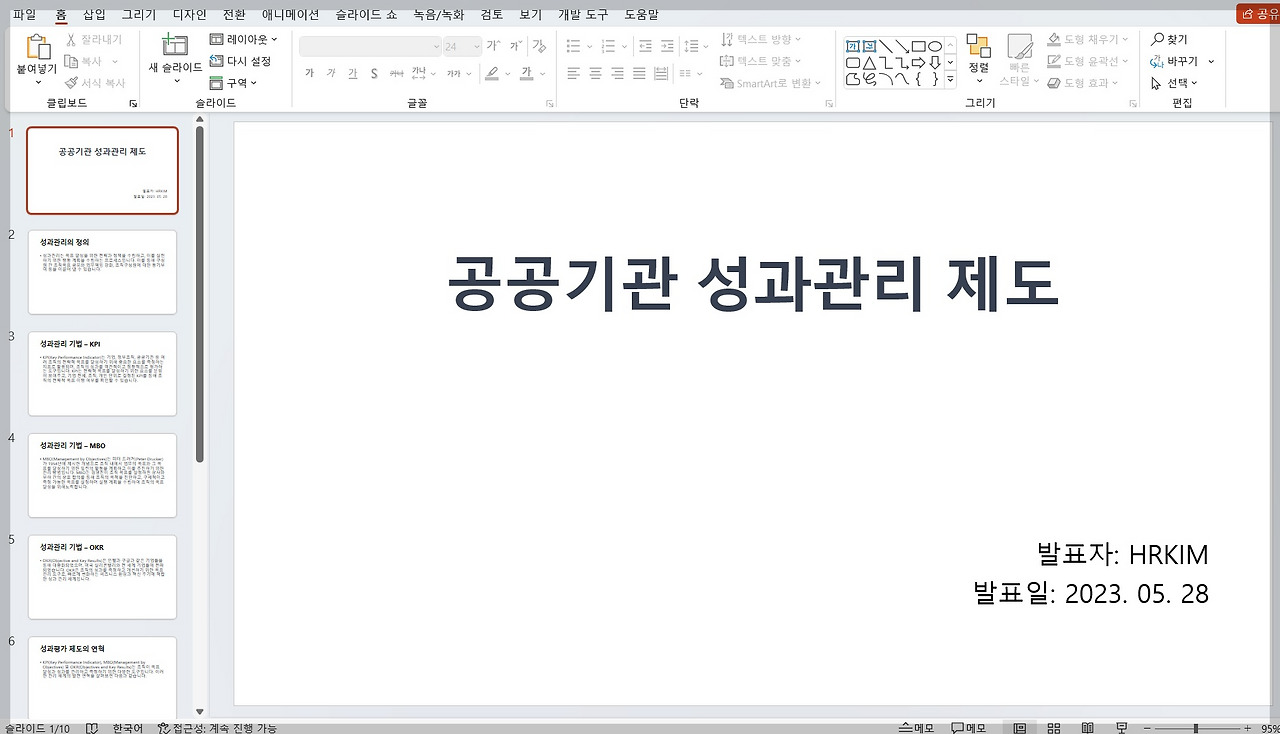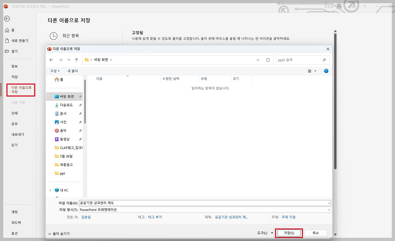PPT에 Word 개요를 삽입하여 빠르게 PPT 슬라이드를 작성할 수 있었습니다. 슬라이드에 개요를 삽입한 후에는 제목 슬라이드, 목차 슬라이드, 본문 슬라이드 등 다양한 레이아웃 옵션을 활용해 내용을 깔끔하게 정리할 수 있습니다. 위의 캡처 화면은 워드로 작성한 개요를 PPT 슬라이드에 삽입하여 표시된 것을 확인한 후, 이를 다시 Web PPT로 실행하기 위해 PPT 파일로 저장하는 과정을 보여줍니다.