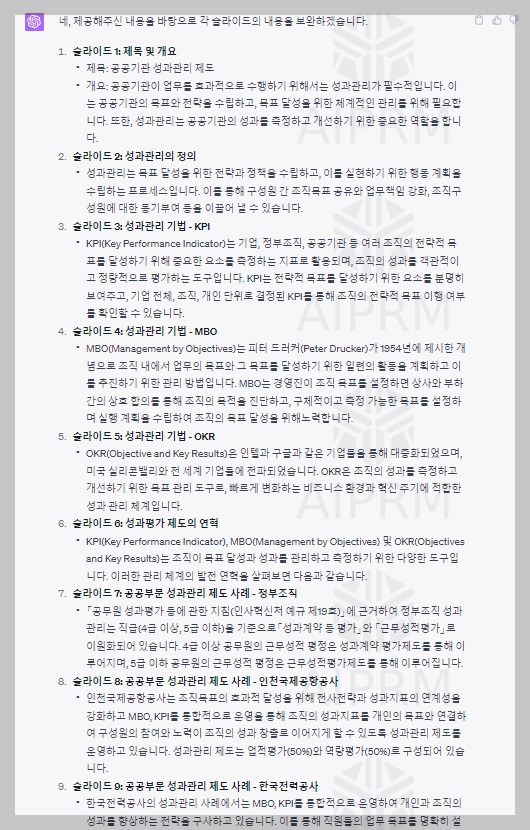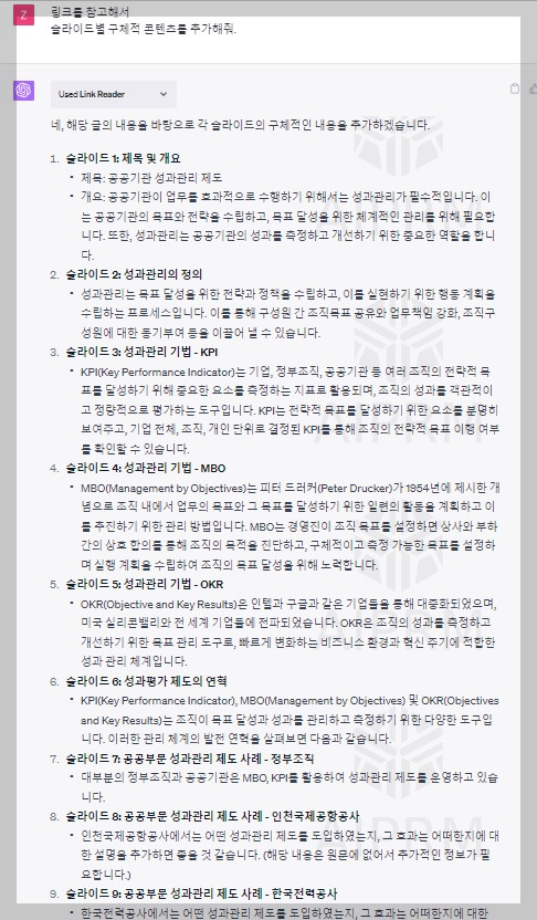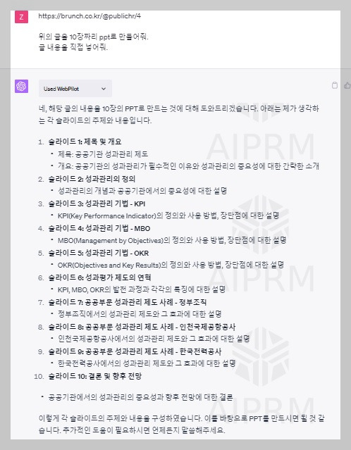 아래의 내용은 Chat GPT와의 대화 내용입니다. 제 브런치 글 중 '공공기관 성과관리 제도' 링크를 Chat GPT에게 제공하고 대화를 진행하였습니다. 이를 통해 어떻게 작업이 진행되는지 확인해 보시길 바랍니다.