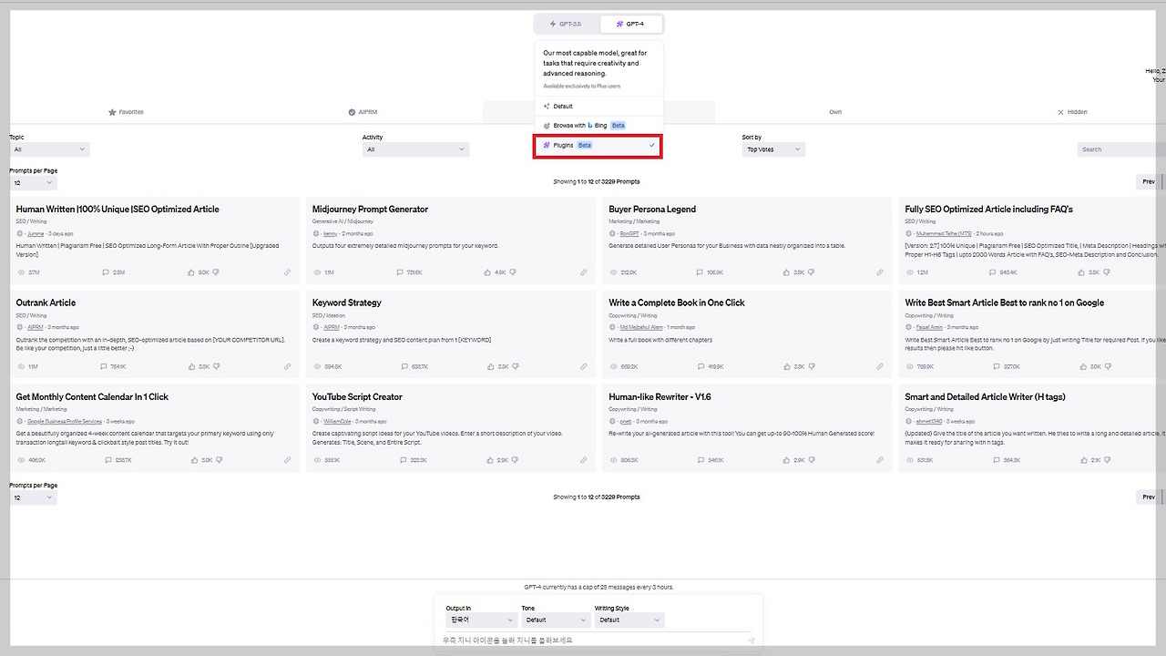 다만, 주의하셔야 할 점은 Chat GPT Plugin은 Chat GPT-4에서만 사용하실 수 있습니다. 즉, Chat GPT 유료 사용자만 Chat GPT Plugin을 이용할 수 있습니다. 그러므로, 플러그인을 이용하려면 먼저 Chat GPT의 유료 가입을 해야 합니다. 아래에는 Chat GPT에 플러그인을 설치하고 사용하는 과정을 캡처한 화면입니다. 이를 참고하여 플러그인을 설치하시기 바랍니다.