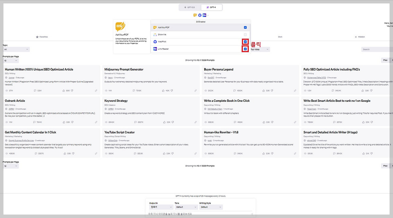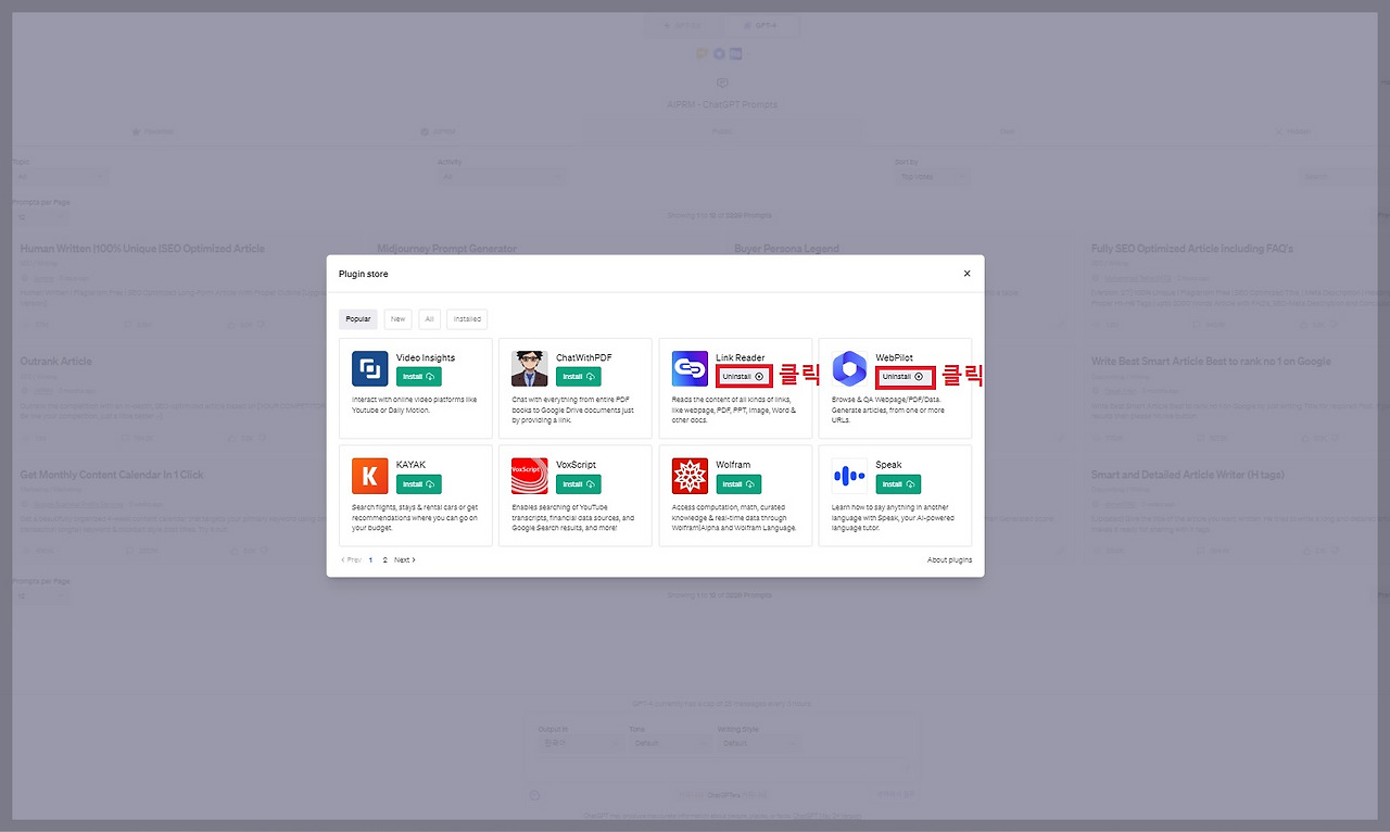 먼저 위의 캡처화면에서 볼 수 있듯이, 'Link Reader'와 'WebPilot'이라는 두 가지 Chat GPT 플러그인을 설치하고자 합니다. 이 두 플러그인은 URL을 제공하면 Chat GPT가 해당 웹페이지에 직접 접근하여 해당 URL의 내용을 파악하고, 그 정보에 대해 사용자와의 대화를 나눌 수 있는 기능을 가지고 있습니다.