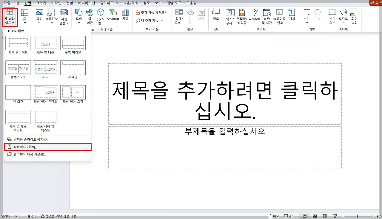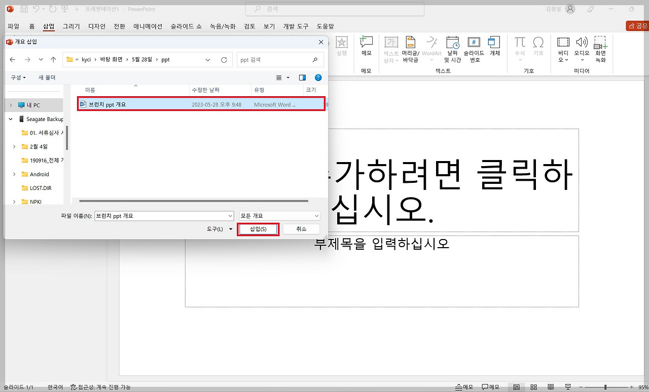 이제 워드로 작성한 개요를 PPT 슬라이드로 옮겨보겠습니다. PPT를 실행한 후에 [삽입] - [새 슬라이드] - [슬라이드 개요] 순으로 진행하시면, 파일 삽입 화면이 활성화됩니다. 여기에서 앞서 워드로 작성하고 저장한 개요 파일을 선택하시면 됩니다.