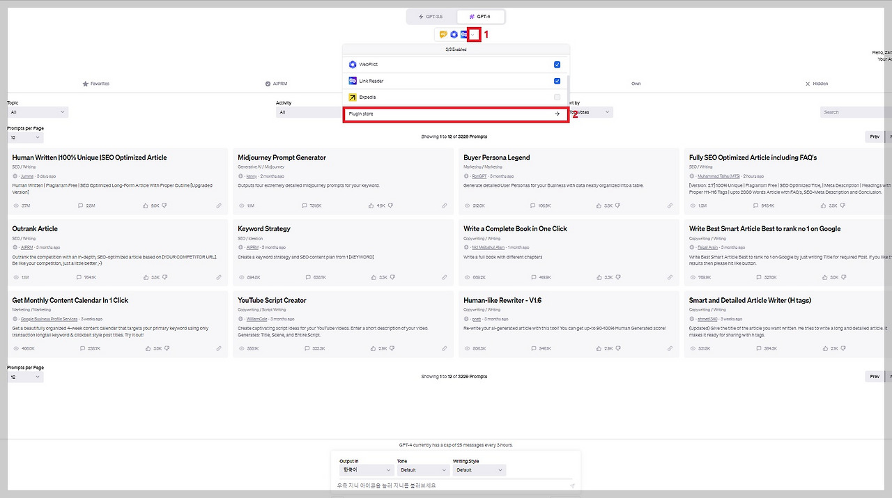 플러그인을 사용하려면 먼저 Store에서 원하는 플러그인을 다운로드하여야 합니다. 그 후, 사용하고자 하는 플러그인을 활성화해야 합니다(최대 3개의 플러그인까지 활성화 가능). 이 과정 후 Chat GPT는 대화를 수행하면서 해당 기능 실행이 필요한 상황이 오면 자동으로 해당 플러그인을 활용합니다.