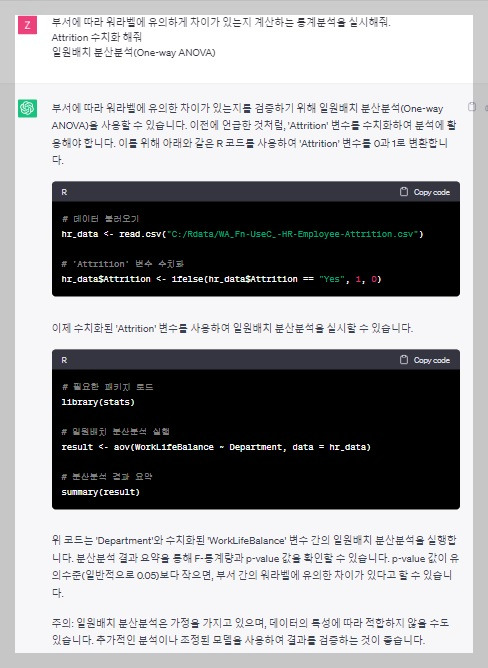 위 왼쪽 화면 중 프롬프팅 내용을 살펴보시면 '먼저 cor() 함수의 결과를 데이터 프레임으로 변환해줘.', '퇴직률(Attrition) - 퇴직률 (Attrition) 상관관계는 제외해줘.' 등의 프롬프팅을 추가적으로 명시했습니다. 이는 제가 깊은 R 코딩 지식이 있어서 보단 Chat GPT가 처음 알려준 프롬프트를 통해 R 코드를 실행했을 시에 에러가 생겼습니다. 발생한 에러 메시지를 다시 Chat GPT에 전해주고 해결책을 전달받은 내용을 한꺼번에 프롬프팅 한 내용입니다. 실제로 Chat GPT의 도움을 받아 코딩을 수행하실 시에는 위와 같이 프롬프팅을 한꺼번에 넣어줄 필요는 없습니다. 에러가 나서 에러 메시지를 Chat GPT에 넣어주면 Chat GPT는 바로 코드를 수정해 줍니다.