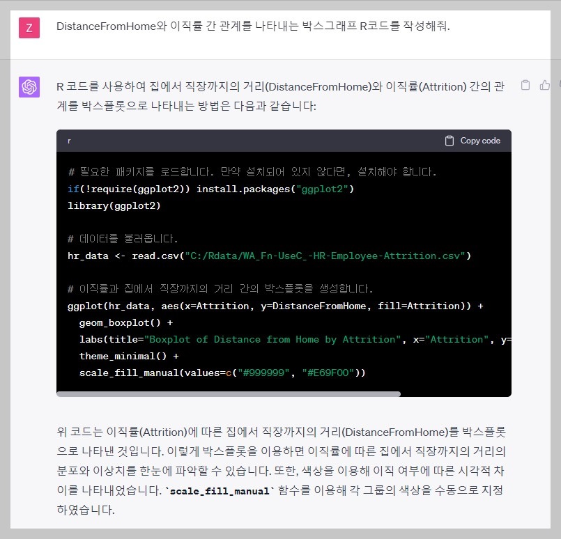 매번 언급드리는 내용이지만 ChatGPT의 등장은 데이터 분석 진입장벽을 크게 낮췄습니다. 이전에는 R를 활용하여 통계분석을 수행하기 위해서는 R 코딩과 통계학에 대한 심도 있는 이해가 필요했지만, 지금은 Chat GPT을 통해 통계 지식을 이해하는데 도움을 받을 수도 있으며, 코드를 짜는데도 큰 도움을 받을 수 있습니다. 이번 분석에서는 ChatGPT의 도움을 받아 R을 활용하여 IBM의 HR 데이터를 시각화하고 이를 해석하는 과정을 살펴보겠습니다.