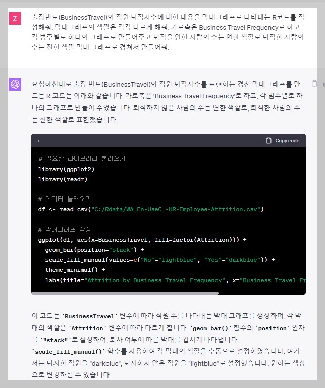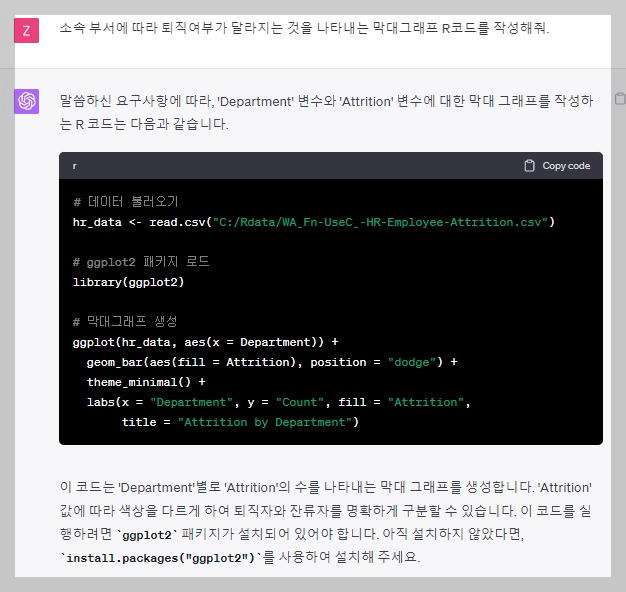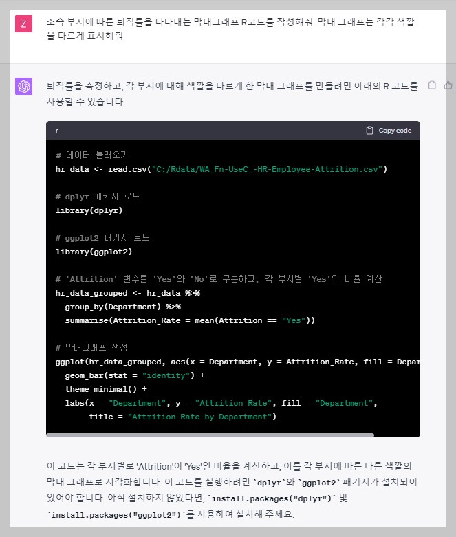 데이터 시각화를 활용하여 부서 간 퇴직률에 차이가 있는지에 대해 시각화와 통계분석을 통해 고민해 보는 과정을 공유해 보도록 하겠습니다. 먼저 Chat GPT에게 부서에 따른 퇴직여부를 시각화하는 R 코드를 작성해 달라고 요청하겠습니다.
