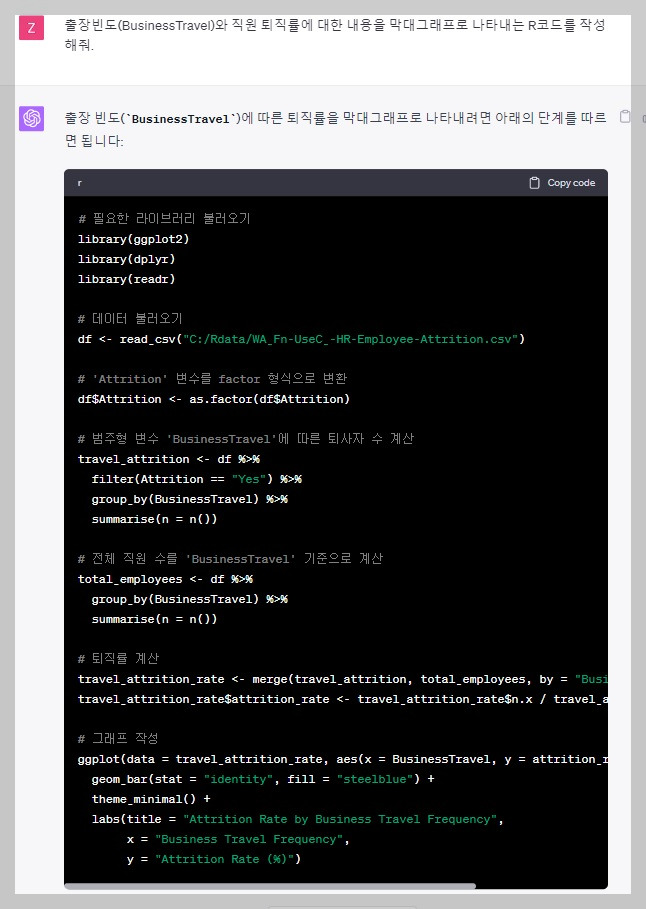 이러한 범주형 변수들을 기반으로 퇴직한 직원과 잔류한 직원의 분포를 시각화해 보겠습니다. 특히 이러한 카테고리형 변수들과 퇴직률 간의 연관성을 파악하는 것은 중요합니다. R을 활용하여 각 카테고리별 퇴직률을 막대그래프로 나타내 보겠습니다. 먼저, 출장빈도(Travel Frequency)와 퇴직률을 막대그래프로 산출하는 R코드를 Chat GPT로부터 받고 이를 R에 입력하여 그래프를 생성해 보았습니다. 더 나아가, 프롬프팅을 조금씩 바꿔서 다양한 형태의 그래프 시각화를 수행할 수 있습니다.