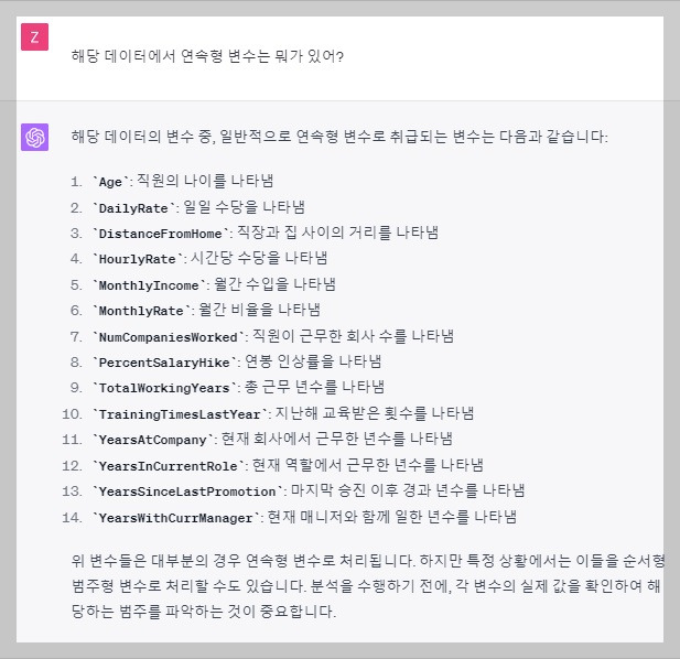 IBM HR 데이터에는 또한 연속형 변수들이 존재합니다. 이들은 나이(Age), 월급(Rate), 근무 연수(YearsAtCompany) 등이 있습니다. Chat GPT에게 Data 내 연속형 변수에 대해서 질문을 하니 데이터에 있는 연수형 변수에 대해서 자세히 설명해 줍니다.