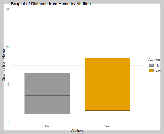 시각화 자료에서 이와 같이 나타나는 특징들은 집-직장 간 거리가 퇴직여부에 유의한 영향을 미칠 가능성이 있다는 것을 의미합니다. 그러나, 이렇게 관찰된 경향이 실제로 "집에서 직장까지의 거리가 퇴사에 유의한 영향을 미친다"라는 결론을 내리기 위해서는 로지스틱 회귀분석 등 추가적인 통계 분석이 필요합니다.