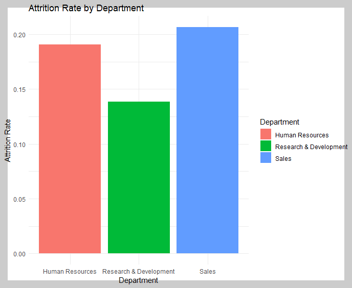 위 그림은 부서에 따른 퇴직자 수를 나타내는 그래프입니다. 하지만 보시면 알겠지만 어느 부서가 퇴직률이 가장 높은지 직관적으로 파악하기 어렵습니다. 따라서 다시 Chat GPT에게 부서에 따른 퇴직률 그래프를 산출하는 R코드를 요청하였습니다.